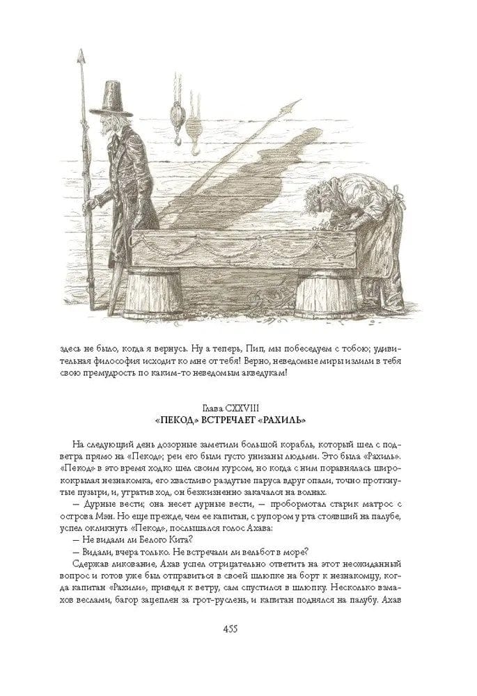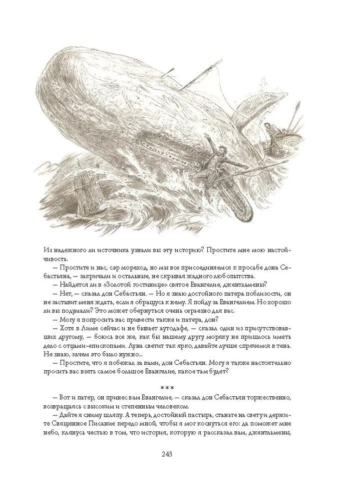 Китобойное судно «Пекод» отправляется в дальнее плаванье. На его борту пестрая команда моряков разных рас и национальностей. Но морским охотникам предстоит узнать, что главная цель капитана их судна Ахава вовсе не китовый жир и спермацетовое масло. Его сердце пылает огнем мщения. Он охотится за легендарным и опасным китом-альбиносом Моби Диком, лишившим Ахава ноги в одном из предыдущих плаваний. Герман Мелвилл, имевший опыт китобоя, подробно и со знанием дела описывает жизнь охотников за китами. Со страстью любознательного первооткрывателя он рассказывает об океане и его обитателях. Но за живыми деталями и характерами вырастает трагедия библейского масштаба, где перед героями романа встают вопросы самого высокого порядка: о жизни и смерти, добре и зле. Иллюстрации Антона Ломаева уже украсили издания «Моби Дика» на английском, французском, китайском, литовском и русском языках. Специально для этой книги, вышедшей в издательстве «Лорета», вдобавок к прежним иллюстрациям художник сделал сорок новых рисунков, которые помогут читателю погрузиться в волнующий мир великого романа.