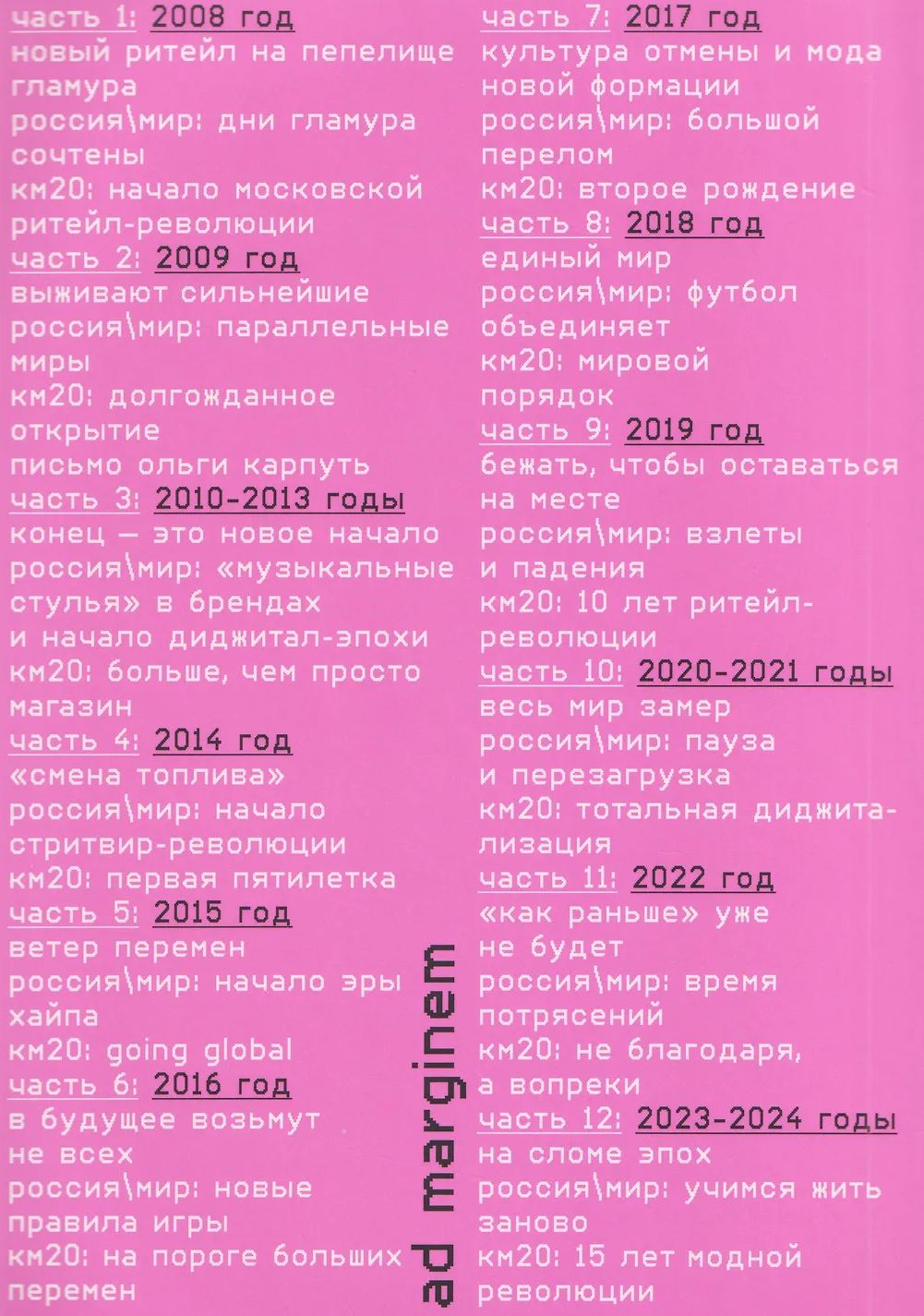«Мода 2.0. История индустрии с 2008 года» — это хроника современной моды, рассказанная через призму одного из самых влиятельных пространств российского фэшн-ландшафта — концепт-стора КМ20. От глобальных трендов до локальных культурных сдвигов, от первых коллабораций с Vetements и Raf Simons до цифровой эпохи и новых форм самовыражения — книга прослеживает, как менялась индустрия и как КМ20 оставался на переднем крае этих перемен. Структура книги соединяет три линии — «Мир», «Россия» и «КМ20», показывая, как мировые процессы отражаются в локальном контексте и трансформируются в уникальные культурные явления. Некоторые главы также сопровождают личные письма Ольги Карпуть, в которых основательница КМ20 от первого лица рассказывает о ключевых этапах своего профессионального пути. Это не просто документ времени — это визуальная и текстовая панорама моды, медиа и культуры за последние полтора десятилетия, рассказанная изнутри теми, кто создавал её контуры.