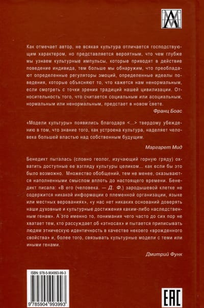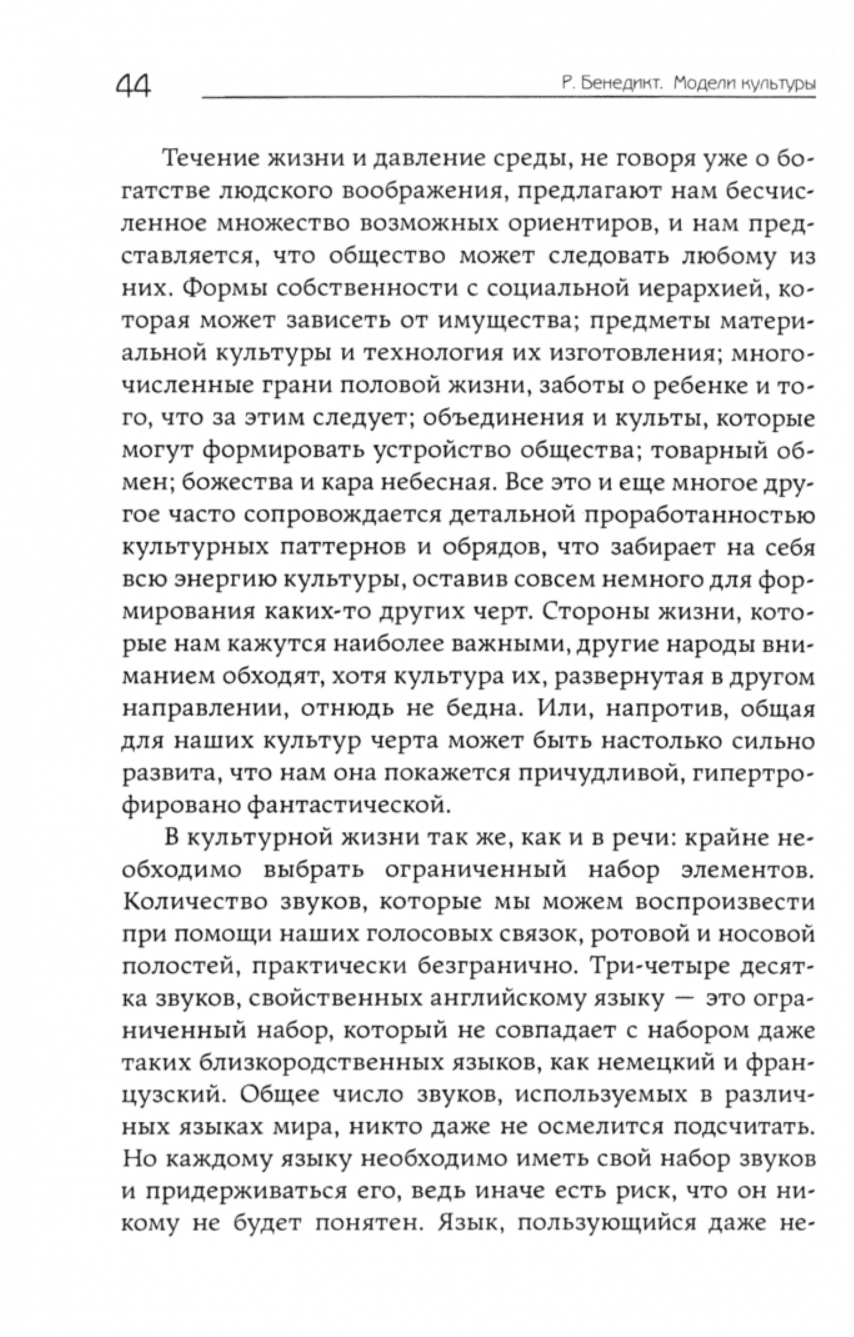 «Если бы народ не делал из кровной наследственности символа и лозунга, нас все еще объединяли бы общие убеждения, общественные нормы и мировоззрение — культура как психологическая целостность». Подчеркивая главные достоинства нашей и признавая ценности других культур, мы порой забываем о прошлом; противопоставляем частные аспекты не только «им», «другим», соседям, но и собственной истории. Рут Бенедикт говорит о необходимости смотреть глубже: видеть не только уникальную конфигурацию внутрикультурных элементов для каждой общности, но и совокупное содержание. Понимать исключительность каждой цивилизации.