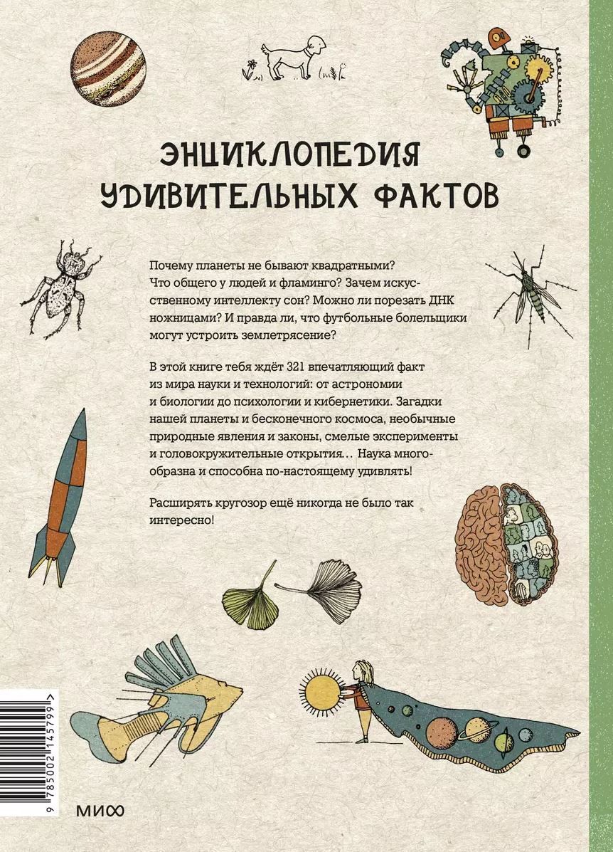 Почему планеты не бывают квадратными? Как выиграть в «Монополию» с помощью математики? Зачем искусственному интеллекту сон? В этой книге собран 321 познавательный факт из мира науки и технологий: от астрономии и биологии до психологии и кибернетики. Вы узнаете о самых неожиданных исследованиях и открытиях, об изобретениях, поражающих воображение, и о великих ученых, чья работа помогает изменить мир. Живой юмор и забавные иллюстрации не дадут заскучать, а новыми знаниями непременно захочется поделиться с друзьями.