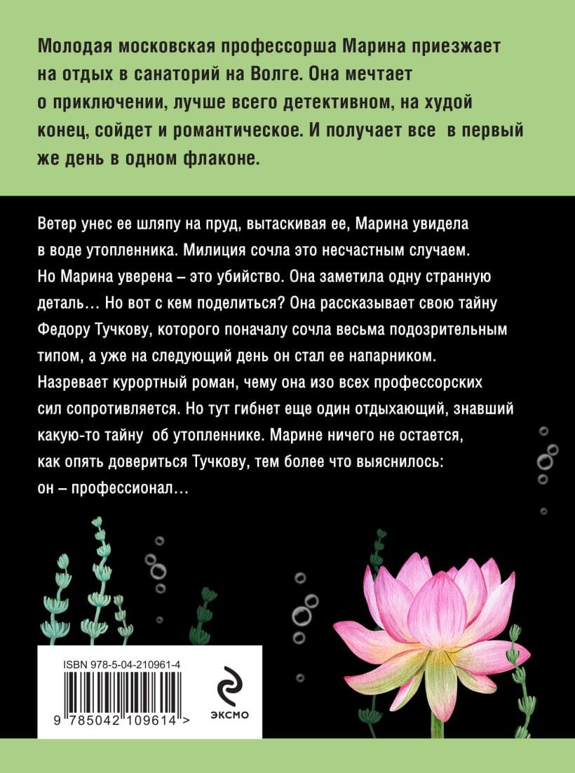 Молодая московская профессорша Марина приезжает на отдых в санаторий на Волге. Она мечтает о приключении, лучше всего детективном, на худой конец сойдет и романтическое. И получает все в первый же день в одном флаконе. Ветер унес ее шляпу на пруд, вытаскивая ее, Марина увидела в воде утопленника. Милиция сочла это несчастным случаем. Но Марина уверена — это убийство. Она заметила одну странную деталь… Но вот с кем поделиться? Она рассказывает свою тайну Федору Тучкову, которого поначалу сочла весьма подозрительным типом, а уже на следующий день он стал ее напарником. Назревает курортный роман, чему она изо всех профессорских сил сопротивляется. Но тут гибнет еще один отдыхающий, знавший какую-то тайну об утопленнике. Марине ничего не остается, как опять довериться Тучкову, тем более что выяснилось: он — профессионал…