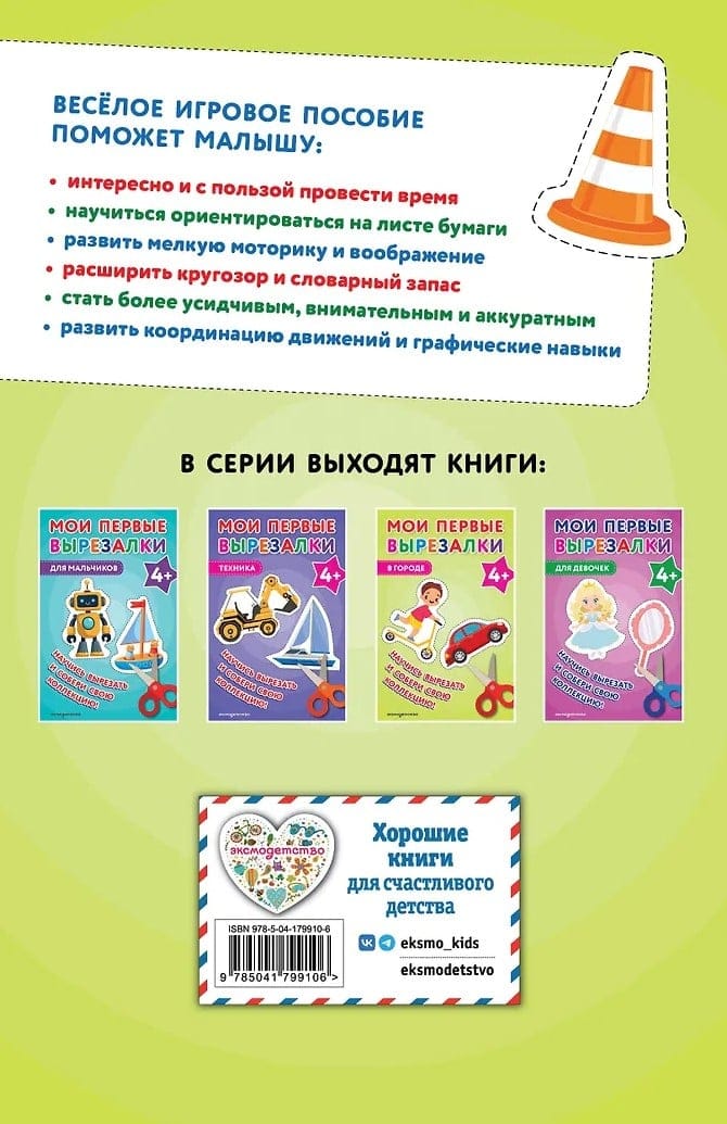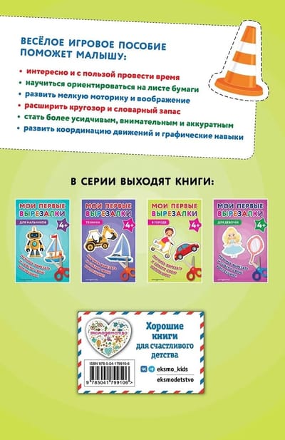 Удобный формат, плотная бумага, которая не рвется при вырезании, и 60 крупных и ярких картинок для вырезания делают работу с книгой максимально комфортной и интересной. Пунктирные линии подскажут, где именно нужно резать, и помогут ребенку почувствовать уверенность.