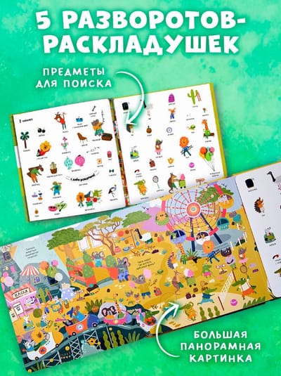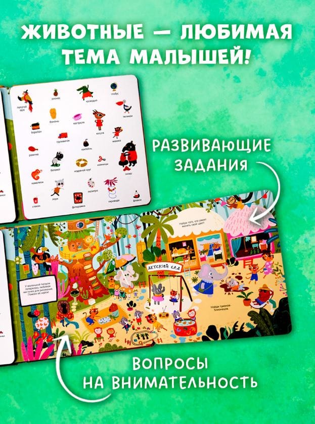 Добро пожаловать в удивительный мир животных! На страницах этой книги для детей целых пять панорамных разворотов и более 200 предметов для поиска. Вы познакомитесь с самыми разнообразными животными и узнаете, где они обитают. А еще посмеетесь, рассматривая, как в лесу лягушонок устроил чаепитие, а в саванне зебра потеряла зеленую сумочку.