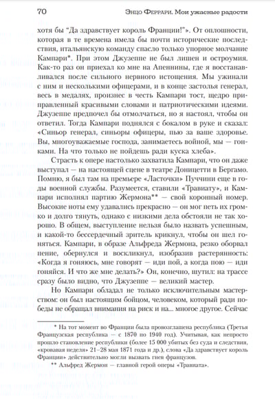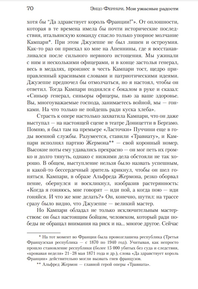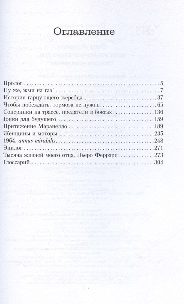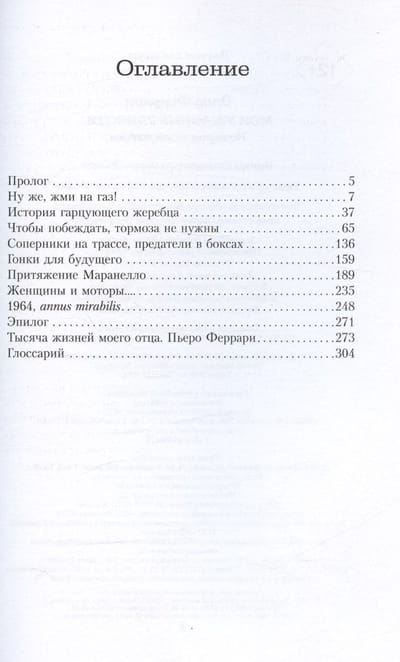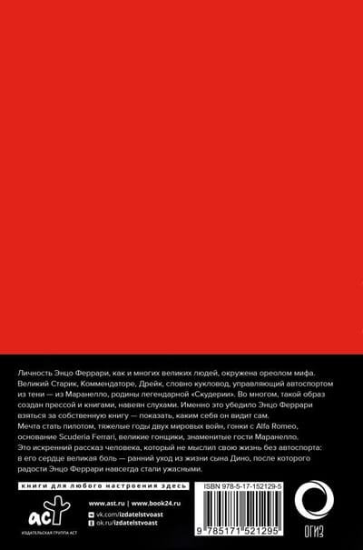 Мечта стать пилотом, тяжелые годы двух мировых войн, гонки с Alfa Romeo, основание Scuderia Ferrari, великие гонщики, знаменитые гости Маранелло. Это искренний рассказ человека, который не мыслил свою жизнь без автоспорта; в его сердце великая боль — ранний уход из жизни сына Дино, после которого радости Энцо Феррари навсегда стали ужасными.
