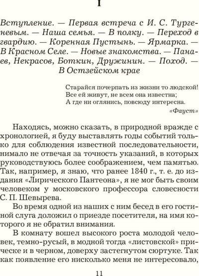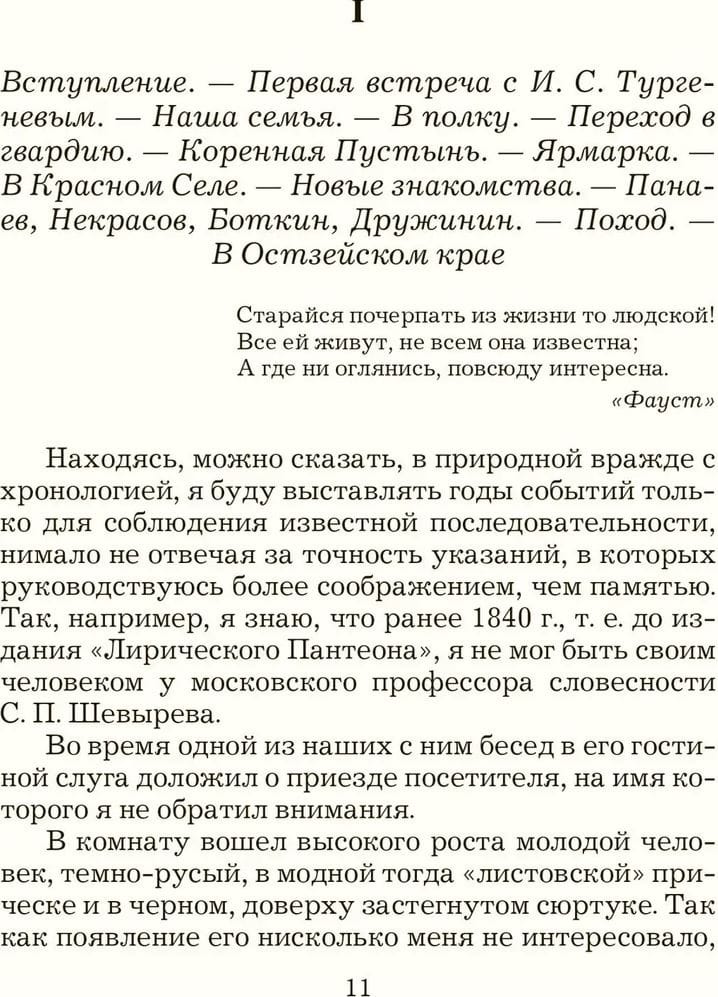 Мемуары Афанасия Афанасьевича Фета (1820-1892) представляют собой биографический источник первостепенной важности и охватывают большую часть жизни известного поэта. Фет стремился фотографически точно запечатлеть ушедший «жизненный поток», наполняя повествование повседневной обыденностью и житейскими мелочами и подробно описывая свое детство, тайну рождения, учебу, любовь, войну, путешествие в Европу, встречу с Тургеневым и многое другое. «Я не философствую, а припоминаю и рассказываю», — пояснял он.