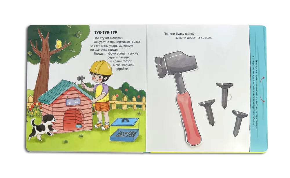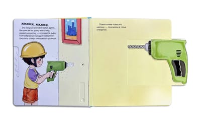 Первая книга-конструктор. На каждом развороте издания расположены интерактивные элементы, которые максимально реалистично показывают, как работают строительные инструменты. Некоторые из них издают звук, как на настоящей стройке. У папы есть ящик со строительными инструментами. Теперь он есть и у тебя. Открывай книжку-игрушку, доставай со страничек отвёртку, гаечный ключ, молоток и начинай играть. Благодаря подвижным элементам, которые выглядят и работают как настоящие, ты сможешь просверлить отверстие, закрутить гайку, забить гвоздь и не только. А ещё некоторые элементы издают звук. Теперь ты можешь помогать взрослым. Данная развивающая книга отлично подходит для детей 3-4 лет. Она может служить энциклопедией инструментов: в ней перечислены основные инструменты и показаны принципы их работы. Интерактивные элементы помогают в развитии мелкой моторики. Познаём мир вместе.