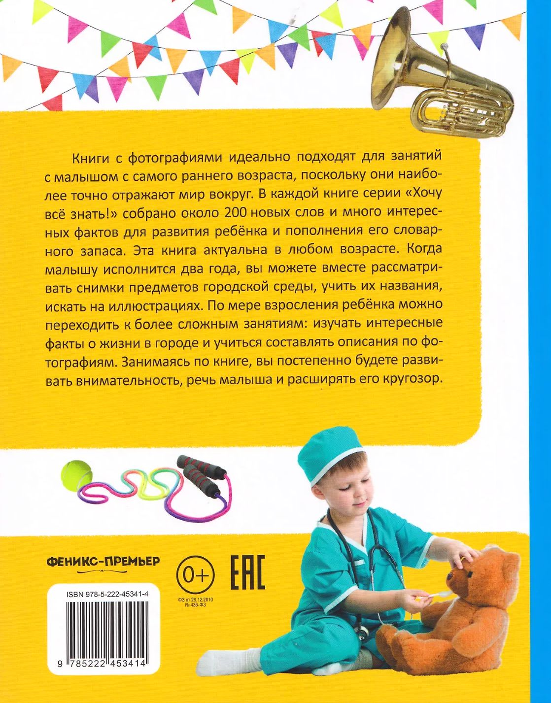 В каждой книге серии «Хочу всё знать!» собрано около 200 новых слов и много интересных фактов для развития ребёнка и пополнения его словарного запаса. Эта книга актуальна в любом возрасте. Когда малышу исполнится два года, вы можете вместе рассматривать снимки предметов городской среды, учить их названия, искать на иллюстрациях. По мере взросления ребёнка можно переходить к более сложным занятиям: изучать интересные факты о жизни в городе и учиться составлять описания по фотографиям. Занимаясь по книге, вы постепенно будете развивать внимательность, речь малыша и расширять его кругозор.