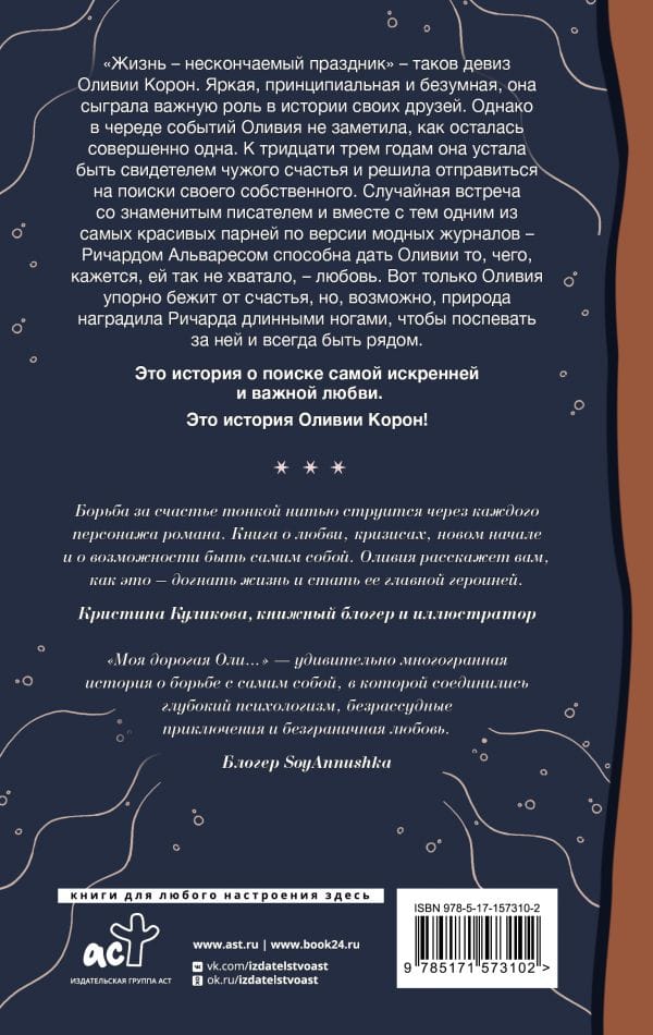 «Жизнь — нескончаемый праздник» — таков девиз Оливии Корон. Яркая, принципиальная и безумная, она сыграла важную роль в истории своих друзей. Однако в череде событий Оливия не заметила, как осталась совершенно одна. К тридцати трем годам она устала быть свидетелем чужого счастья и решила отправиться на поиски своего собственного. Случайная встреча со знаменитым писателем и вместе с тем одним из самых красивых парней по версии модных журналов — Ричардом Альваресом способна дать Оливии то, чего, кажется, ей так не хватало, — любовь. Вот только Оливия упорно бежит от счастья, но, возможно, природа наградила Ричарда длинными ногами, чтобы поспевать за ней и всегда быть рядом.