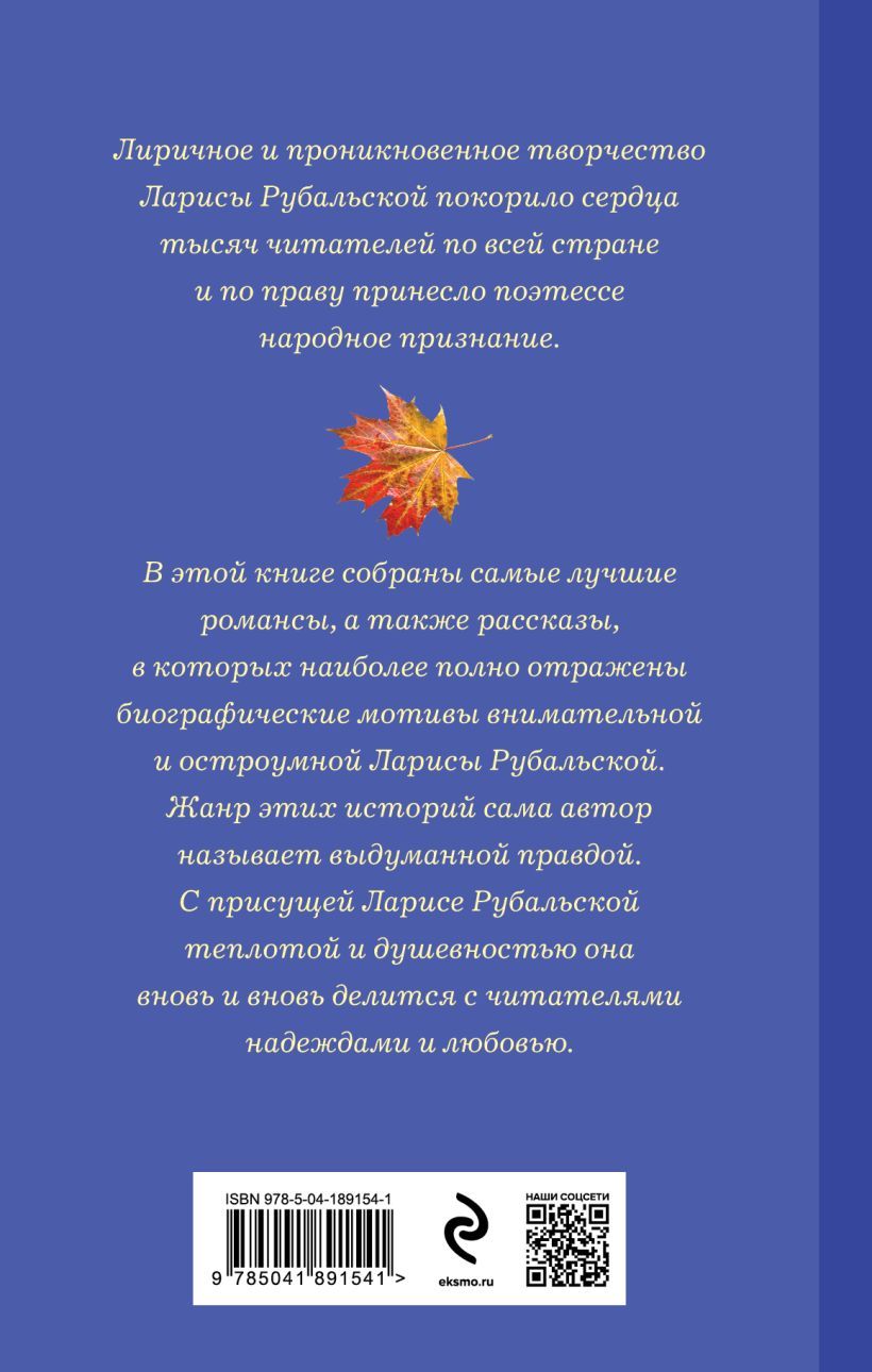 Лиричное и проникновенное творчество Ларисы Рубальской покорило сердца тысяч читателей по всей стране и по праву принесло поэтессе народное признание. В этой книге собраны самые лучшие романсы Ларисы Рубальской, а также рассказы, в которых наиболее полно отражены биографические мотивы внимательной и остроумной Ларисы Рубальской. Жанр этих историй сама автор называет «выдуманной правдой». С присущей Ларисе Рубальской теплотой и душевностью она вновь и вновь делится с читателями надеждами и любовью.
