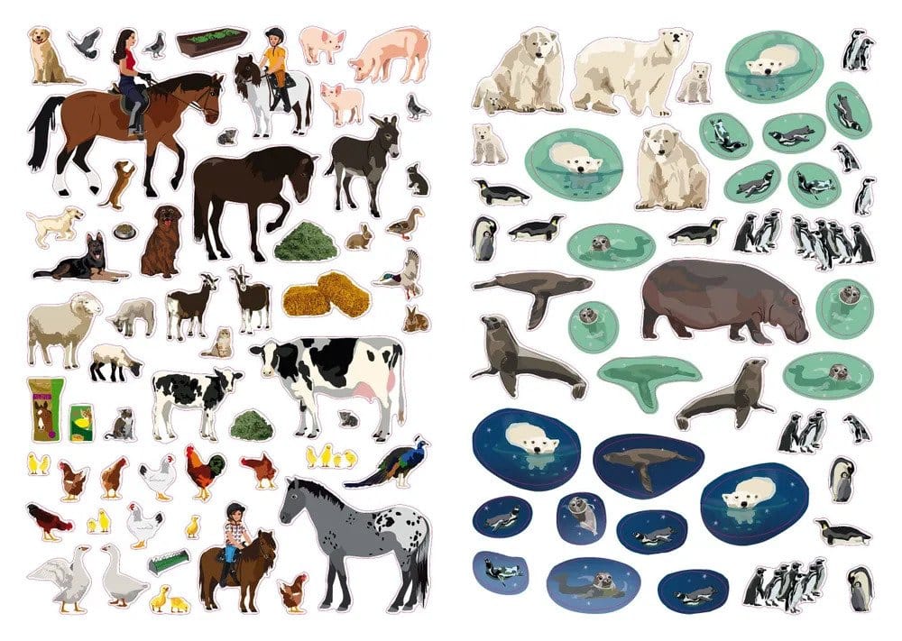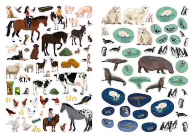 На 13 разворотах ты сможешь рассмотреть их поближе и узнать о том, как и где они живут, а также побывать в саванне, погостить на ферме, оказаться среди коралловых рифов и пр. Оживи с помощью более 400 ярких наклеек развороты книги, насели их обезьянами и слонами, зебрами и пингвинами, экзотических рыбами и домашними животными. Включи воображение и создай свой собственный мир животных. Ищи, приклеивай и фантазируй!