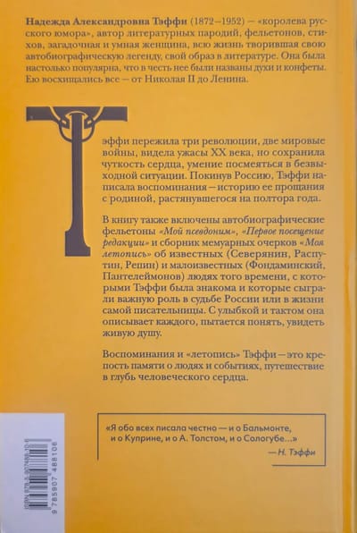 Тэффи пережила три революции, две мировых войны, видела ужасы XX века, но сохранила чуткость сердца, умение посмеяться в безвыходной ситуации. Покинув Россию, Тэффи написала воспоминания - историю ее прощания с родиной, растянувшегося на полтора года. В книгу также включены автобиографические фельетоны «Мой псевдоним», «Первое посещение редакции» и сборник мемуарных очерков «Моя летопись» об известных (Бальмонт, Аверченко, Распутин, Репин) и малоизвестных (Фондаминский, Пантелеймонов) людях того времени, с которыми Тэффи была знакома и которые сыграли важную роль в судьбе России или в жизни самой писательницы. С улыбкой и тактом она описывает каждого, пытается понять, увидеть живую душу. Воспоминания и «летопись» Н. Тэффи - это крепость памяти о людях и событиях, путешествие в глубь человеческого сердца.