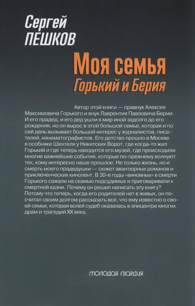 Автор этой книги — правнук Алексея Максимовича Горького и внук Лаврентия Павловича Берии. И его прадед, и его дед ушли в мир иной до его рождения, но он вырос в этой большой семье, которая и по сей день вызывает большой интерес у журналистов, писателей, кинематографистов. Его детство прошло в Москве в особняке Шехтеля у Никитских ворот, где когда-то жил Горький и где теперь находится его музей, где происходили многие важнейшие события, которые по-прежнему волнуют тех, кому интересно наше прошлое. Не только жизнь, но и смерть его прадедушки — сюжет авантюрных романов и приключенческих кинолент. В 30-е годы «виновных» в смерти Горького сажали на скамью подсудимых и приговаривали к смертной казни. Почему он решил написать эту книгу? Потому что теперь, когда его родителей нет в живых, он посчитал своим долгом рассказать все, что ему известно о своей семье, которая волей судеб оказалась в эпицентре многих драм и трагедий ХХ века
