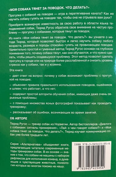 Прогулка с собакой на поводке - игра в перетягивание каната? Как же научить собаку гулять на поводке так, чтобы она не отрывала вам руки? Приобретя всемирную известность за свою работу в области языка телодвижений собак, Тюрид Ругос обратила свое внимание на частую проблему - прогулку с собаками, которые тянут за поводок. Из книги Моя собака тянет за поводок. Что делать? вы узнаете о методе Тюрид, который позволяет быстро и легко научить собаку любого возраста, размера и породы спокойно гулять на провисающем поводке. Удивительно простой и гуманный метод Тюрид Ругос основан на глубоком понимании того, почему собаки тянут, как они обучаются, и что нужно сделать, чтобы решить создавшуюся проблему. Этот метод позволит сделать прогулку в городе или на природе более расслабленной и снизить уровень стресса как у собаки, так и у хозяина.