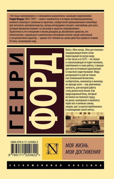 Книга «Моя жизнь. Мои достижения» (выдержавшая более сотни переизданий по всему миру, в том числе и в СССР) — это живая и захватывающая история человека, влюбленного в свою работу, ставшую для него источником вдохновения и смыслом существования. Форд раскрывается в ней не только как гениальный бизнесмен, изобретатель, инноватор и инженер, но прежде всего — как увлеченная личность, для которой работа стала делом всей жизни. Как прирожденный боец, который не боялся ни тяжелого труда, ни риска, выигрывал и ошибался, терял все и начинал заново, упорно, шаг за шагом приближаясь к воплощению своей мечты.