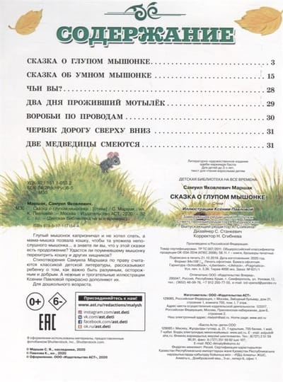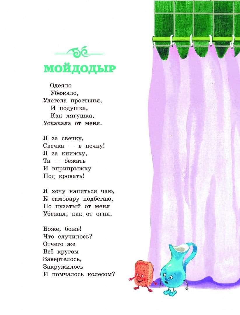Прочитав эту книгу, малыши познакомятся со знаменитыми героями Корнея Чуковского – строгим Мойдодыром и бабушкой Федорой, узнают, почему надо умываться по утрам и вечерам и держать свои вещи в порядке и что будет, если этого не делать. Увлекательные сказки в стихотворной форме не оставят ребёнка равнодушным. Текст прекрасно дополняют классические иллюстрации Сергея Бордюга и Натальи Трепенок.