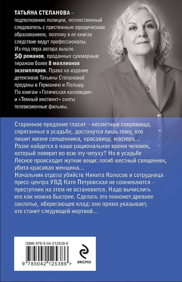 Старинное предание гласит — несметные сокровища, спрятанные в усадьбе, достанутся лишь тому, кто лишит жизни священника, красавицу, мастера… Разве найдется в наше рациональное время человек, который поверит во всю эту чепуху? Но в усадьбе Лесное происходят жуткие вещи: погиб местный священник, убита красивая женщина… Начальник отдела убийств Никита Колосов и сотрудница Пресс-центра УВД Катя Петровская не сомневаются — преступник на этом не остановится. Надо вычислить его как можно быстрее. Сделать это поможет древнее заклятие, оберегающее клад: оно прямо указывает, кто станет следующей жертвой…