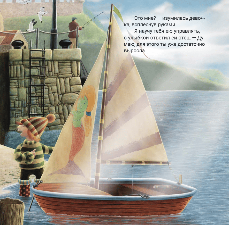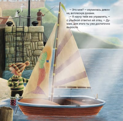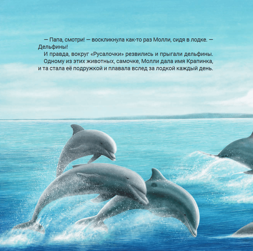 Папа-моряк построил небольшую лодку для Молли и учит её ходить под парусом. Вскоре Молли уже скользит по волнам на своей «Русалочке», а вокруг прыгает и резвится стая дельфинов. Однажды девочка помогает детёнышу своей подружки-дельфинихи Крапинки, когда тот запутывается в рыболовной сети. Но что произойдёт, когда Молли самой понадобится помощь в открытом море?.. Новая красивая и драматичная история из полюбившейся юным читателям-дошколятам серии про девочку с рыбацкого острова рассказывает о том, как Молли покоряет морские просторы — с радостью, уверенностью в своих силах и, конечно же, добротой.