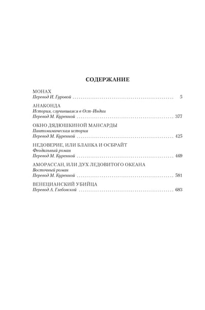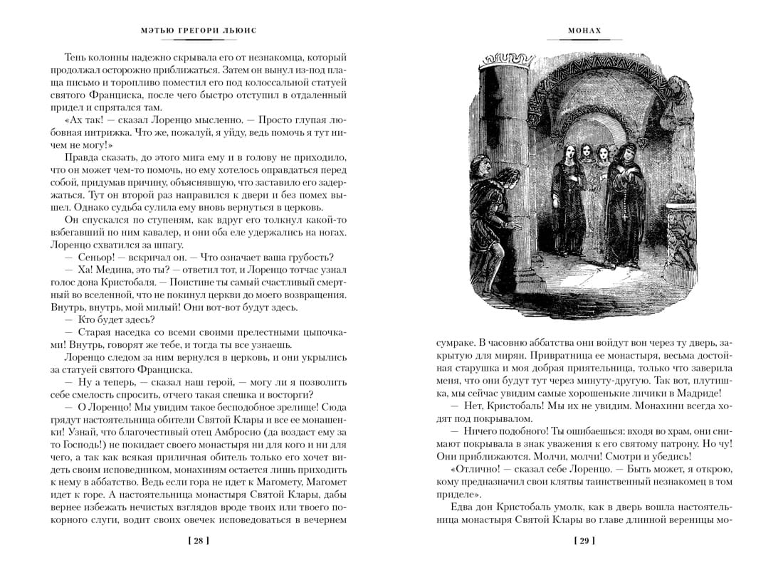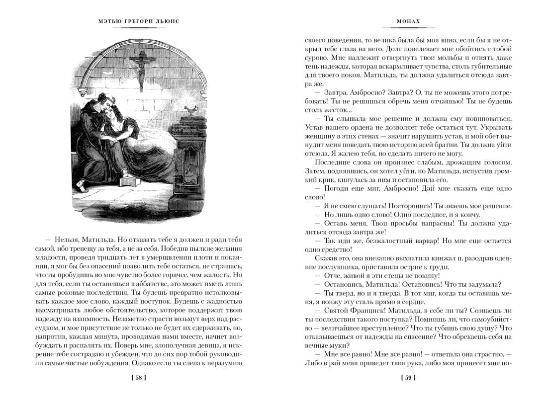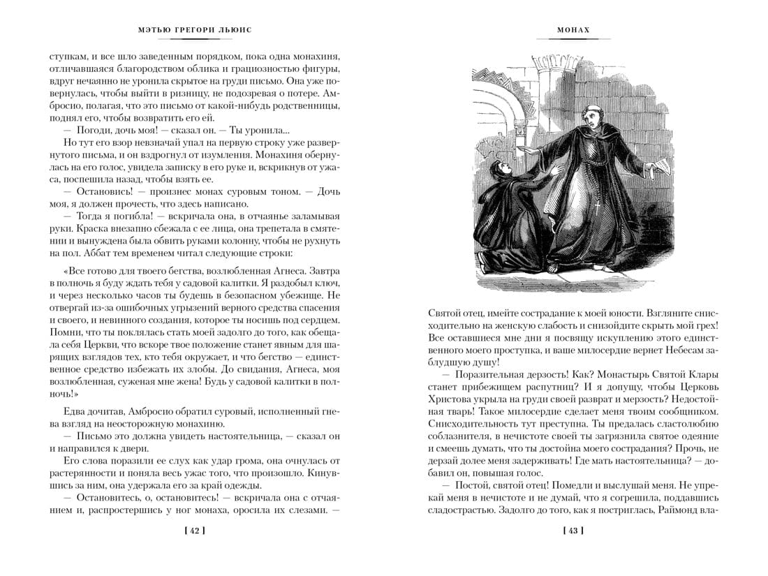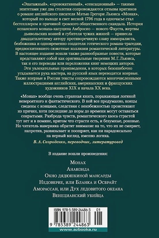 «Эпатажный», «провокативный», «сенсационный» — такими эпитетами уже два столетия сопровождаются отзывы критиков о романе английского писателя Мэтью Грегори Льюиса «Монах», который по выходе в свет весной 1796 года в одночасье стал бестселлером и причиной громкого общественного скандала. История испанского монаха-капуцина Амбросио — нового Фауста, жертвы дьявольских козней и губителя чужих жизней — принесла двадцатилетнему автору противоречивую славу имморалиста, безбожника и одновременно создателя готического романа-трагедии, предвосхитившего сюжетные коллизии романтической литературы. В настоящее издание вошли также разнообразные повести, которые представляют собой как оригинальные творения М. Г. Льюиса, так и его переводы или переложения книг немецких авторов. Эти увлекательные произведения, в которых безошибочно угадывается рука мастера, на русский язык переводятся впервые. Также впервые в России тексты сопровождаются многочисленными иллюстрациями английских, американских и французских художников XIX и начала XX века.
