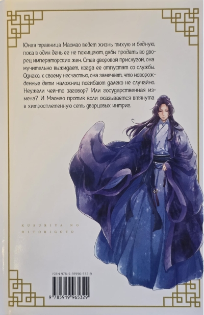 В первом томе манги «Монолог фармацевта» юная травница Маомао ведет скромную жизнь, пока однажды не оказывается похищенной и проданной во дворец императорских жен. Став прислугой, она терпеливо ждет своего освобождения, но вскоре замечает, что новорожденные дети наложниц умирают при загадочных обстоятельствах. Маомао оказывается втянутой в опасные дворцовые интриги, где ей предстоит разгадать тайны, угрожающие жизни невинных. Эта манга идеально подойдет любителям историй о приключениях и загадках, а также тем, кто ценит сильных женских персонажей. Подходит для подростков и взрослых, ищущих увлекательное чтение с элементами мистики и драмы.