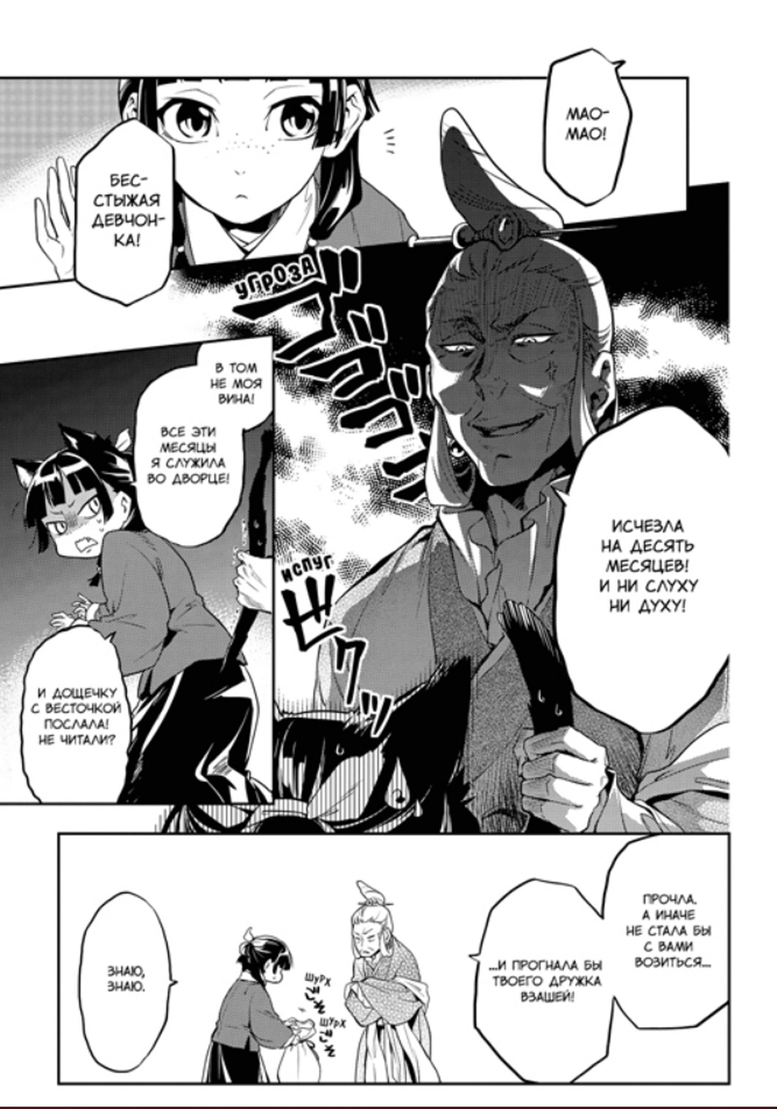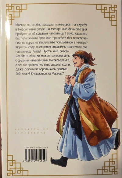 Маомао за особые заслуги принимают на службу в Нефритовый дворец, и теперь она день ото дня пробует на яд кушанья наложницы Гёкуё. Казалось бы, положенный срок она проведет без приключений, но вдруг на пиршестве, устроенном в императорском саду, пытаются отравить нравственную наложницу Лишу! Пусть она совсем молода и едва ли может соперничать с другими наложницами высокого ранга, а все же против нее явно строят козни. Даже служанки обратились против бедняжки! Вмешается ли Маомао?