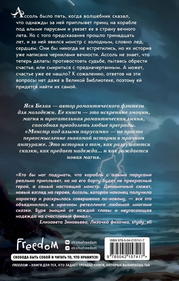 Ассоль было пять, когда волшебник сказал, что однажды за ней приплывет принц на корабле под алыми парусами и увезет ее в страну вечного лета. Но с того предсказания прошло тринадцать лет, и за ней явился монстр с холодным, словно лед, сердцем. Они бы никогда не встретились, но их история уже написана чернилами вечности. Ассоль не знает, что теперь делать: противостоять судьбе, пытаясь обрести счастье, или смириться с предначертанным. А может, счастье уже ее нашло? К сожалению, ответов на эти вопросы нет даже в Великой Библиотеке, поэтому ей придется найти их самой.