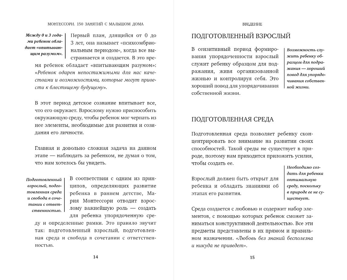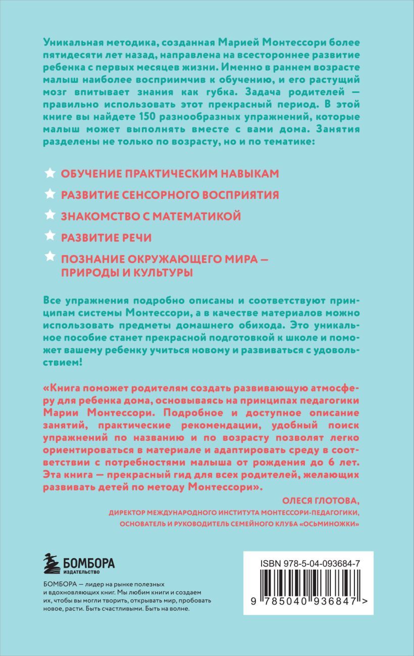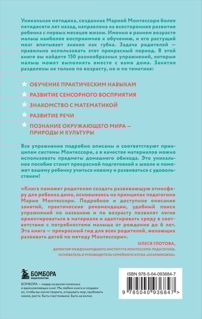 Уникальная методика, созданная Марией Монтессори более пятидесяти лет назад, направлена на всестороннее развитие ребенка с первых месяцев жизни. Именно в раннем возрасте малыш наиболее восприимчив к обучению, и его растущий мозг впитывает знания как губка. Задача родителей - правильно использовать этот прекрасный период. В этой книге вы найдете 150 разнообразных упражнений, которые малыш может выполнять вместе с вами дома. Занятия разделены не только по возрасту, но и по тематике: обучение практическим навыкам, развитие сенсорного восприятия, знакомство с математикой, развитие речи и познание окружающего мира. Все упражнения подробно описаны и соответствуют принципам системы Монтессори, а в качестве материалов можно использовать предметы домашнего обихода. Это уникальное пособие поможет вашему ребенку учиться новому и развиваться с удовольствием!