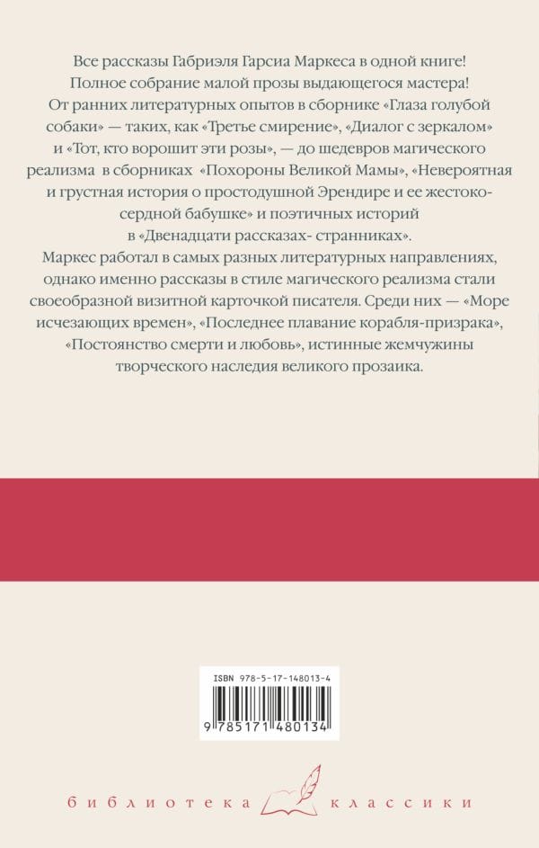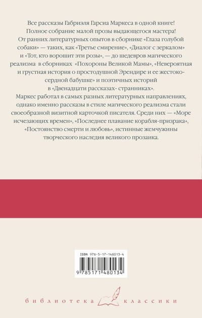 Все рассказы Габриэля Гарсиа Маркеса в одной книге! Полное собрание малой прозы выдающегося мастера! От ранних литературных опытов в сборнике «Глаза голубой собаки» – таких, как «Третье смирение», «Диалог с зеркалом» и «Тот, кто ворошит эти розы», – до шедевров магического реализма  в сборниках  «Похороны Великой Мамы», «Невероятная и грустная история о простодушной Эрендире и ее жестокосердной бабушке» и поэтичных историй в «Двенадцати рассказах-странниках». Маркес работал в самых разных литературных направлениях, однако именно рассказы в стиле магического реализма стали своеобразной визитной карточкой писателя. Среди них – «Море исчезающих времен», «Последнее плавание корабля-призрака», «Постоянство смерти и любовь» – истинные жемчужины творческого наследия великого прозаика.