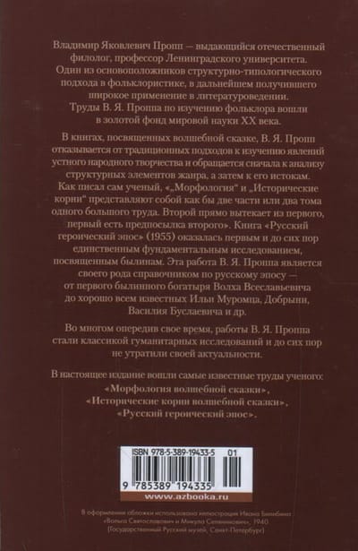 Владимир Яковлевич Пропп — выдающийся отечественный филолог, профессор Ленинградского университета. Один из основоположников структурно-типологического подхода в фольклористике, в дальнейшем получившего широкое применение в литературоведении. Труды В. Я. Проппа по изучению фольклора вошли в золотой фонд мировой науки ХХ века. В книгах, посвященных волшебной сказке, В. Я. Пропп отказывается от традиционных подходов к изучению явлений устного народного творчества и обращается сначала к анализу структурных элементов жанра, а затем к его истокам, устанавливая типологическое сходство между волшебной сказкой и обрядами инициации. Как писал сам ученый, «Морфология» и «Исторические корни» представляют собой как бы две части или два тома одного большого труда. Второй прямо вытекает из первого, первый есть предпосылка второго. Я по возможности строго методически и последовательно перехожу от научного описания явлений и фактов к объяснению их исторических причин». Книга «Русский героический эпос» (1955) оказалась первым и до сих пор единственным фундаментальным исследованием, посвященный былинам. В. Я. Пропп предпринял их сюжетно-тематический и поэтический анализ. Эта работа ученого является своего рода справочником по русскому эпосу — от первого былинного богатыря Волха Всеславьевича до хорошо всем известных Ильи Муромца, Добрыни, Василия Буслаевича и др. Во многом опередив свое время, работы В. Я. Проппа стали классикой гуманитарных исследований и до сих пор не утратили своей актуальности.
