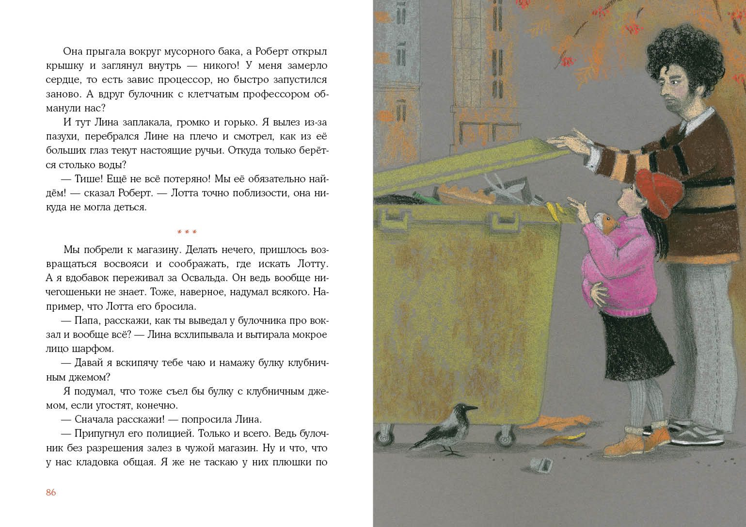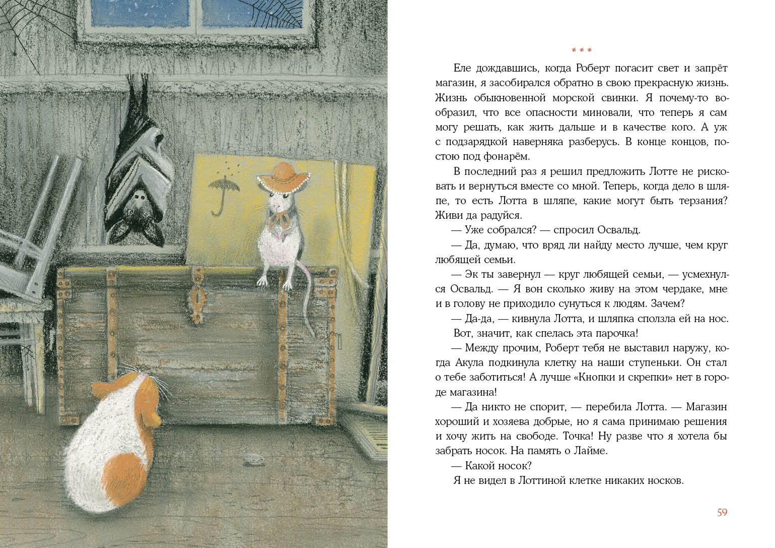 Однажды Морис заметил, что в окно «Кнопки и скрепки» пристально вглядывается незнакомец в клетчатом пальто. А чуть позже Лина рассказала, что в её школе будет читать лекцию заезжий профессор зоологии. Эта новость почему-то ужасно взволновала Мориса, и тут, как назло, Лотта решила сбежать на чердак! Не мог же Морис отпустить её одну! Дальше удивительные события покатились, как снежный ком: путешествие по чердаку, знакомство с летучей мышью Освальдом, таинственное похищение Лотты и главное признание Мориса…