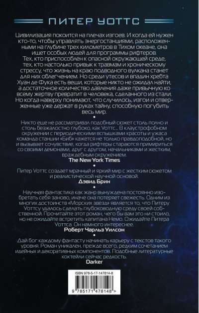 Цивилизация покоится на плечах изгоев. И когда ей нужен кто-то, чтобы управлять энергостанциями, расположенными на глубине трех километров в Тихом океане, она ищет особых людей для программы рифтеров. Тех, кто приспособлен к опасной окружающей среде, тех, кто настолько привык к травмам и хроническому стрессу, что жизнь на краю подводного вулкана станет для них облегчением. Но среди утесов и впадин хребта Хуан де Фука есть вещи, которые никто не ожидал найти, а достаточное количество давления даже привычную ко всему жертву превратит в человека, сделанного из стали. Но когда наверху понимают, что случилось, изгои и отверженные уже держат в руках тайну, способную погубить весь мир.