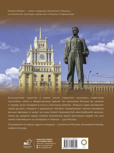 Михаил Жебрак — автор и ведущий программы «Пешком» на канале «Культура», автор книг о Москве и Подмосковье. В этом издании Михаил расскажет о Москве через истории известных москвичей. Ведь никто лучше, чем жители, не сможет показать вам город и рассказать его историю. Именно люди заставляют город дышать и меняться. Пройдитесь по прекрасным улицам Москвы, познакомьтесь с заповедными уголками столицы, посмотрите на широкие проспекты и просторные площади города. Шедевры архитектуры и типовые дома, храмы и памятники — то, что окружает жителей мегаполиса ежедневно. Посмотрите на город с другого ракурса — гуляйте по Москве, понимайте Москву, любите Москву.