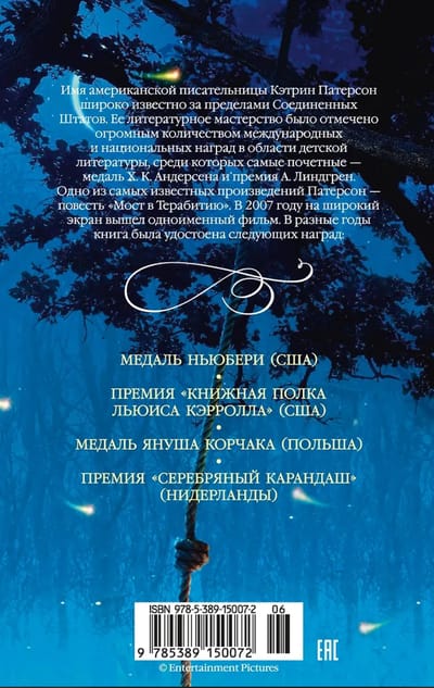 Имя американской писательницы Кэтрин Патерсон широко известно за пределами Соединенных Штатов. Её литературное мастерство было отмечено огромным количеством международных и национальных наград в области детской литературы, среди которых медаль Х.К. Андерсена, премия А. Линдгрен и две медали Ньюбери. Писательница находит в себе смелость говорить о таких «неудобны» вещах, как боль, непонимание, одиночество и даже смерть. Истории Патерсон не всегда хорошо заканчиваются, но они всегда проникнуты надеждой. Именно такие книги помогают юному человеку взрослеть.