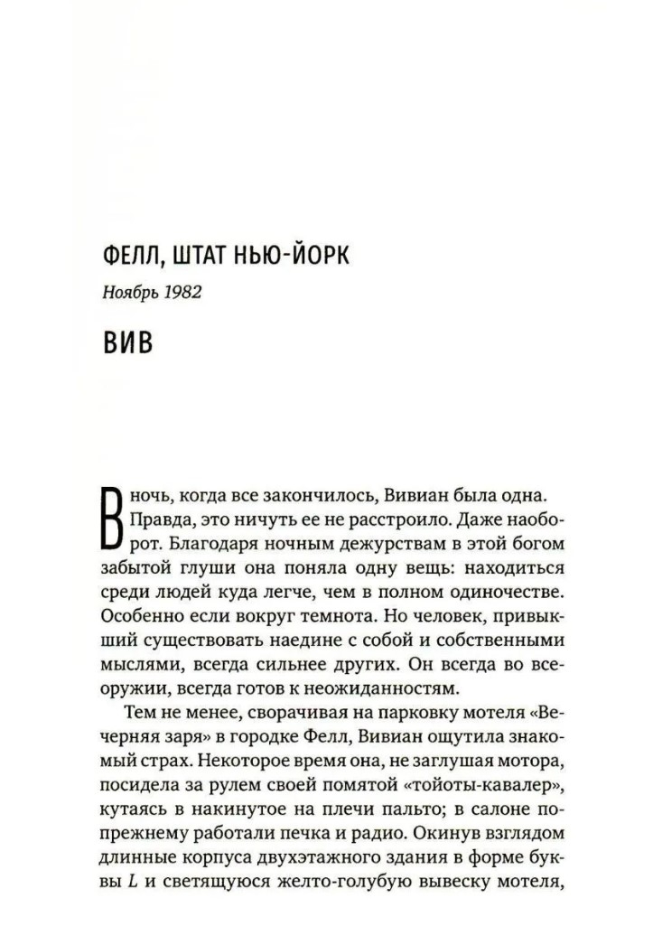Решение двадцатилетней Карли оставить колледж, перебраться в захолустный городок Фелл на севере штата Нью-Йорк и устроиться ночным администратором в старый мотель вызывает удивление у всех ее знакомых и близких. Лишь одна Карли знает его истинную причину — она должна разгадать тайну загадочного исчезновения в этом мотеле тридцать пять лет назад двадцатилетней Вивиан — родной сестры матери Карли. А в мотеле и сейчас что-то неладно…