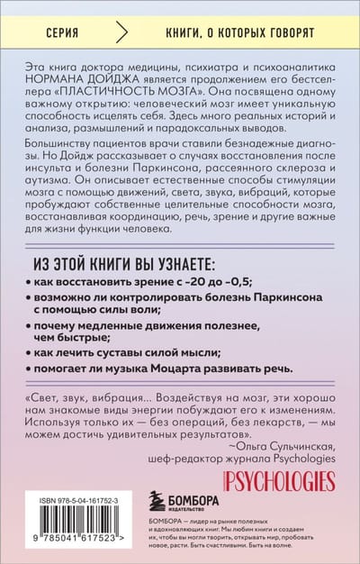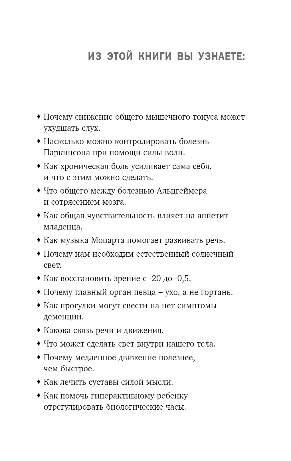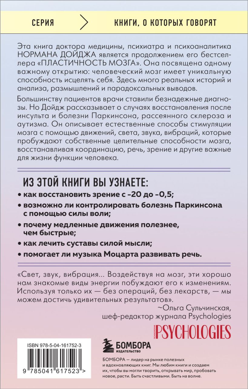 От автора бестселлера «Пластичность мозга». В своей новой книге Норман Дойдж рассказывает об исцеляющих методах нейропластической терапии. Он описывает истории пациентов, которым врачи не давали никакой надежды на выздоровление. Инсульт и рассеянный склероз, аутизм и болезнь Паркинсона всегда считались началом неумолимого угасания основных функций жизнедеятельности человека. Однако последние исследования показали, что естественные способы стимуляции мозга могут активизировать его природные целительные способности, не вызывая побочных эффектов. Активное движение, воздействия с помощью света, звука и вибраций дают поразительные результаты в лечении, казалось бы, безнадежных пациентов.