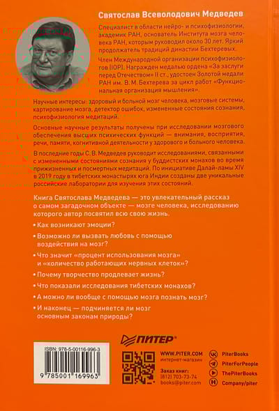 Книга Святослава Медведева – это увлекательный рассказ о самом загадочном объекте – мозге человека, исследованию которого автор посвятил всю свою жизнь. Как возникают эмоции? Возможно ли вызвать любовь с помощью воздействия на мозг? Что значит «процент использования мозга» и «количество работающих нервных клеток»? Почему творчество продлевает жизнь? Что показали исследования тибетских монахов?