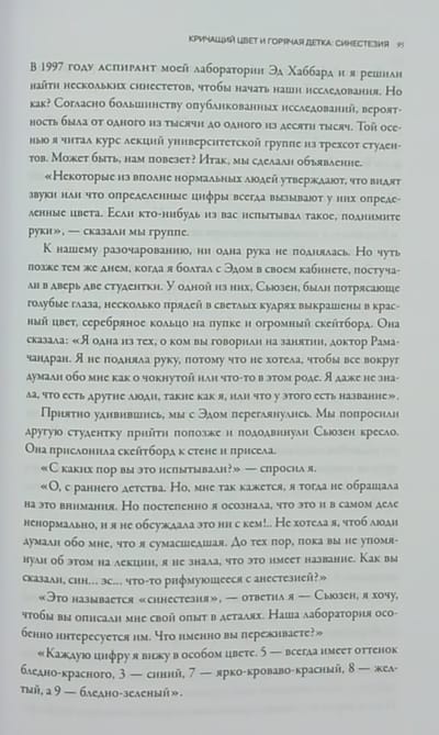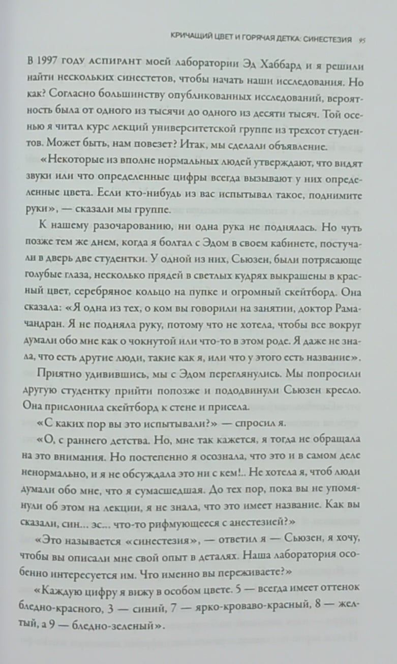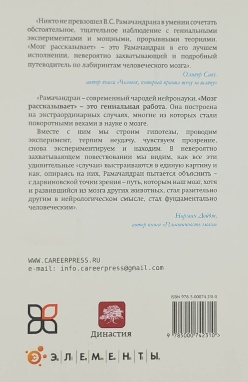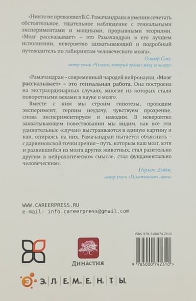 Вильянур Рамачандран (V. S. Ramachandran) настолько опережает всех в своей области, что Ричард Докинз назвал его «Марко Поло нейронауки». В этой новой большой работе Рамачандран говорит о своих открытиях того, что делает человека уникальным. Проводя нас через большое количество практических ситуаций, он рассказывает нам о функциях мозга и его эволюции. Синестезия является, например, окном в мозговые механизмы того, что делает некоторых из нас более творческими чем других. А аутизм—открывателем новых подходов лечения которого является автор—дает нам возможность понять такой аспект нашего бытия как самоосознание. Рамачандран берет наиболее неожиданные и противоречивые вопросы неврологии и с замечательным талантом рассказчика и глубоким мышлением исследователя проливает свет на старые вопросы науки с помощью новых подходов.