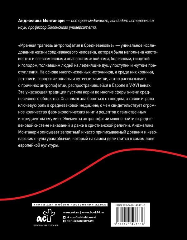 Уникальное исследование жизни средневекового человека, которая была наполнена жестокостью и всевозможными опасностями: войнами, болезнями, нищетой и голодом, толкавшим людей на леденящие душу поступки и жуткие преступления. На основе многочисленных источников, а среди них хроники, летописи, городские анналы и путевые заметки, автор рассказывает о причинах антропофагии, распространившейся в Европе в V-XVI веках. Эта ужасающая традиция пустила корни во многие сферы жизни средневекового общества. Она помогала бороться с голодом, а также играла ключевую роль в средневековой медицине; о чем свидетельствует огромное количество фармакологических книг и рецептов с таинственным ингредиентом «мумиё». Элементы антропофагии можно найти в средневековой системе наказаний и даже в христианской религии. Анджелика Монтанари описывает запретный и часто приписываемый древним и «варварским» культурам обычай, который на самом деле таится в самом лоне европейской культуры.