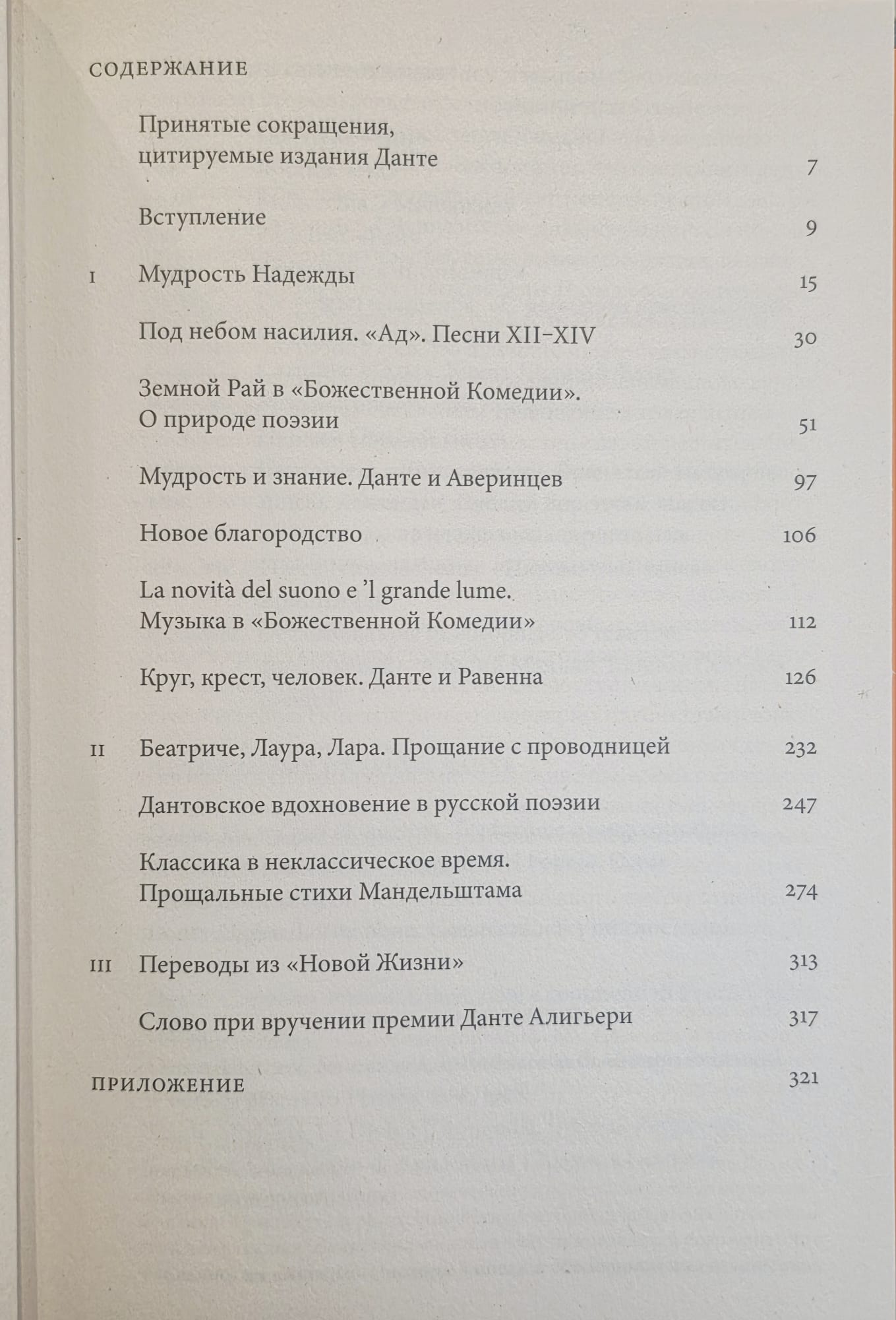Книга разделена на три части. В первом разделе собраны работы, непосредственно связанные с «Божественной Комедией». Среди них особо отметим впервые публикуемое эссе «Круг, крест, человек», посвященное равеннскому Данте и его антропологии, неожиданно созвучной раннехристианской мысли. Во второй раздел входят работы об итальянском контексте Данте и о присутствии Данте в русской поэзии. Третий небольшой раздел включает в себя переводы фрагментов из «Новой Жизни» и возвращает нас к началу дантовского пути. Все переводы с итальянского и других языков выполнены автором. Почти все эссе, вошедшие в книгу, публикуются либо впервые по-русски, либо вообще впервые.