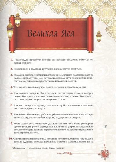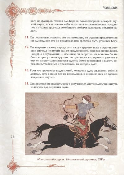 Чингисхан (1152–1227) — гениальный азиатский правитель, основатель и первый великий хан Монгольской империи. «Великая Яса» Чингисхана содержит описание законов великой власти и изречения этого прославленного властителя.
