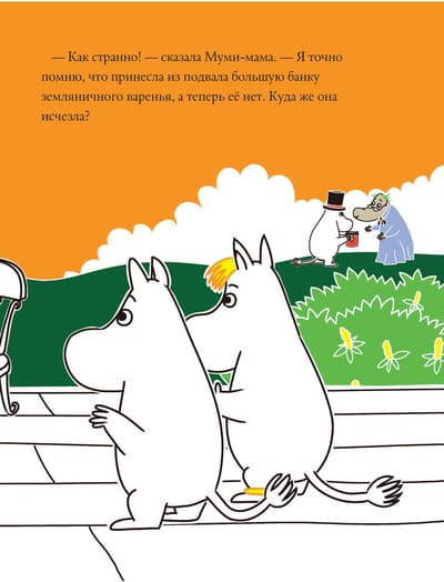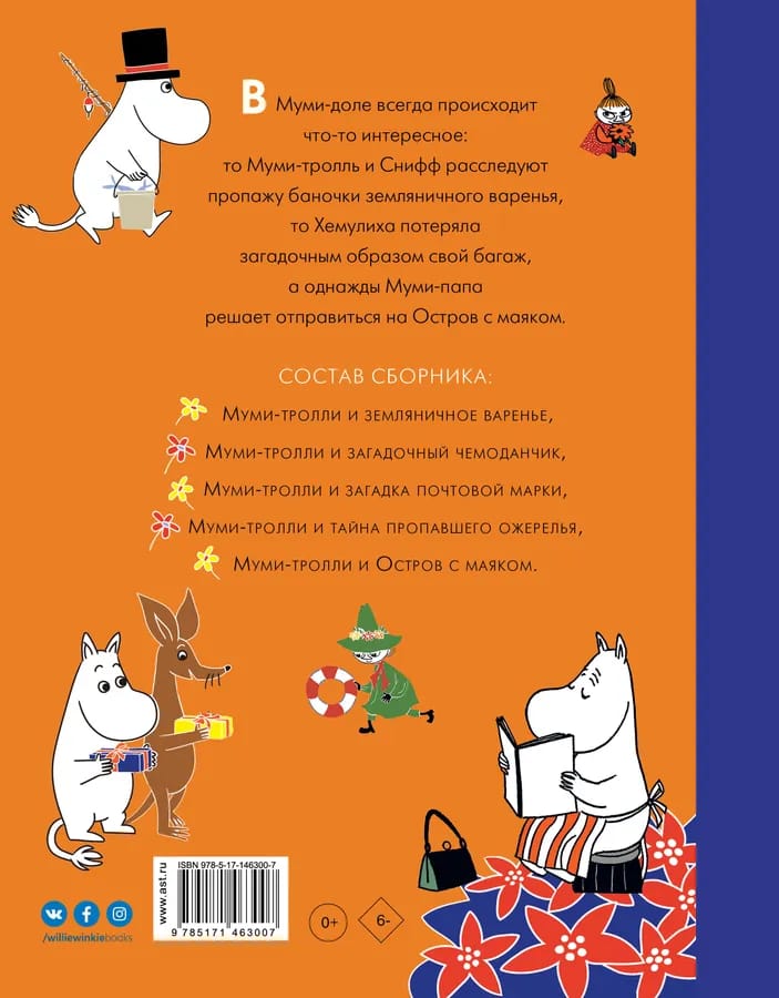В Муми‑доле всегда происходит что‑то интересное: то Муми‑тролль и Снифф, словно Шерлок Холмс и доктор Ватсон, расследуют пропажу баночки земляничного варенья, то Хемулиха потеряла загадочным образом свой багаж, а однажды Муми‑папа вместе со всем своим семейством решает отправиться на Остров с маяком. «Муми‑тролли и Приключения в Муми‑доле» — это весёлый сборник, куда вошли 5 историй: «Муми‑тролли и земляничное варенье», «Муми‑тролли и загадочный чемоданчик», «Муми‑тролли и загадка почтовой марки», «Муми‑тролли и тайна пропавшего ожерелья», «Муми‑тролли и Остров с маяком».