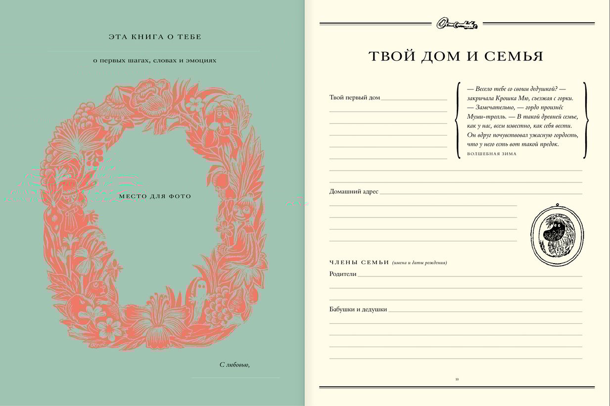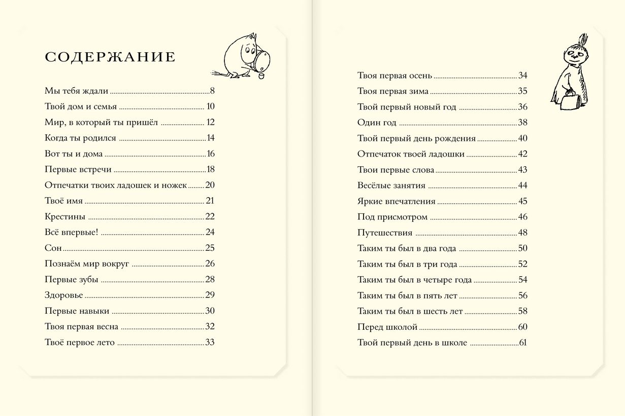 Первые этапы жизни малыша — это целый мир, полный чудес. Важные события и поворотные моменты теперь не потеряются, ведь они будут записаны в книгу, где на каждом развороте живут Муми-тролль, Крошка Мю, Снифф и другие любимые персонажи вселенной Туве Янссон.