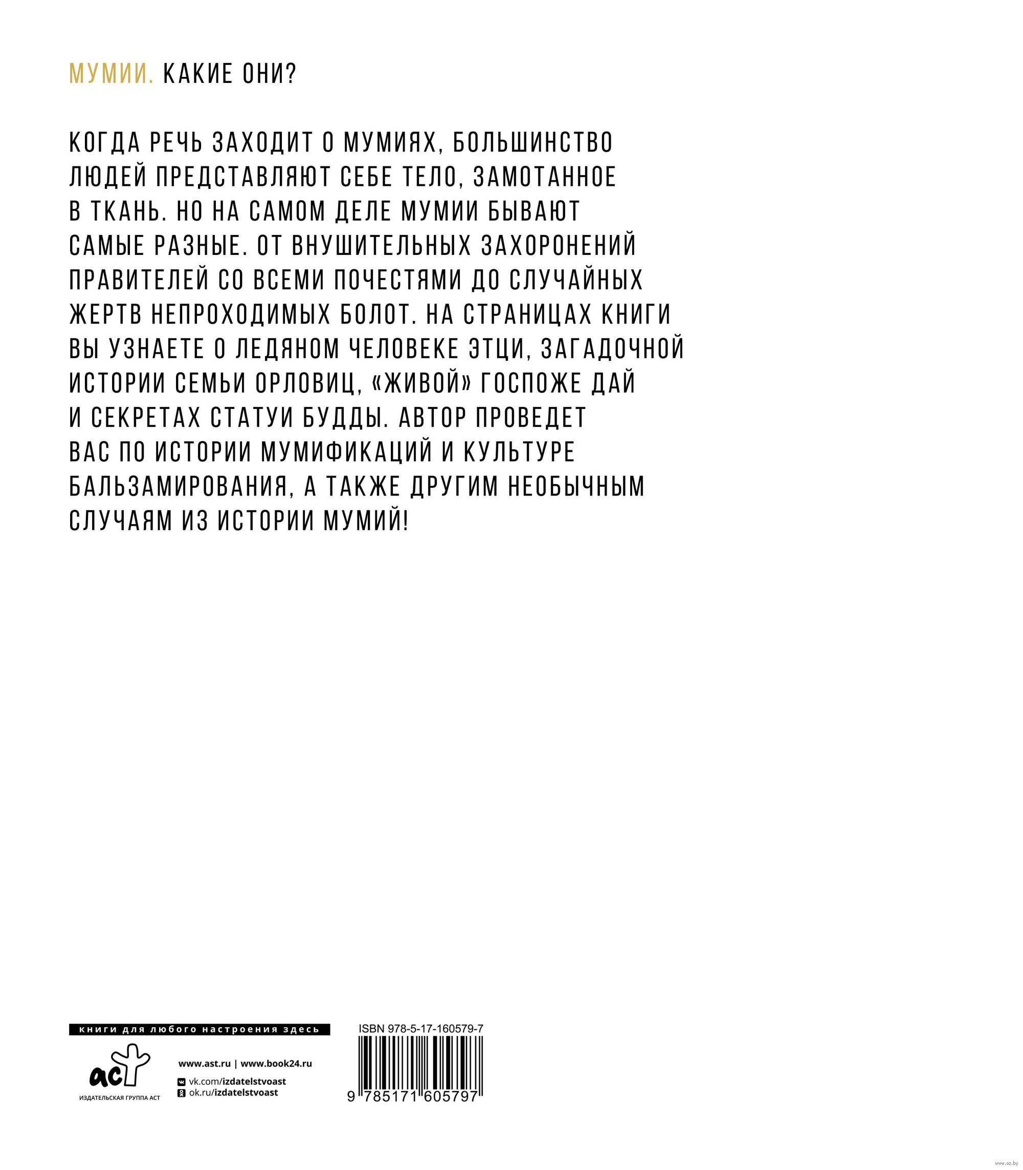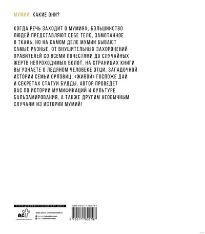 Почему мумий находят высоко в горах и в непроходимых болотах? Зачем вместе с правителем хоронили его слуг, оружие и драгоценности? Кто такой Этци и почему его называют «ледяным человеком»? Автор поможет найти ответы на самые волнующие вопросы как взрослым, так и юным читателям.