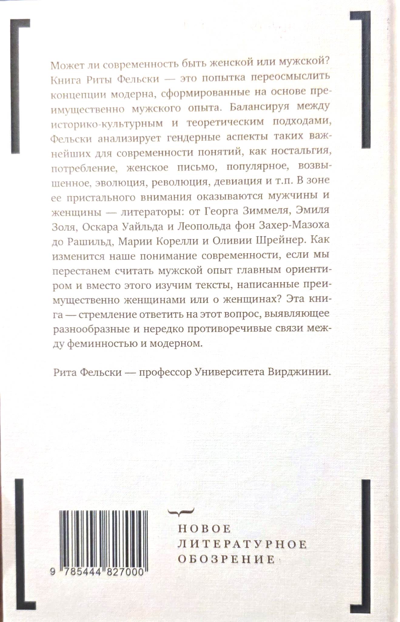 Может ли современность быть женской или мужской? Книга Риты Фельски — это попытка переосмыслить концепции модерна, сформированные на основе преимущественно мужского опыта. Балансируя между историко-культурным и теоретическим подходами, Фельски анализирует гендерные аспекты таких важнейших для современности понятий, как ностальгия, потребление, женское письмо, популярное, возвышенное, эволюция, революция, девиация и т. п. В зоне ее пристального внимания оказываются мужчины и женщины — литераторы: от Георга Зиммеля, Эмиля Золя, Оскара Уайльда и Леопольда фон Захер-Мазоха до Рашильд, Марии Корелли и Оливии Шрейнер. Как изменится наше понимание современности, если мы перестанем считать мужской опыт главным ориентиром и вместо этого изучим тексты, написанные преимущественно женщинами или о женщинах? Эта книга — стремление ответить на этот вопрос, выявляющее разнообразные и нередко противоречивые связи между феминностью и модерном. Рита Фельски — профессор Университета Вирджинии.
