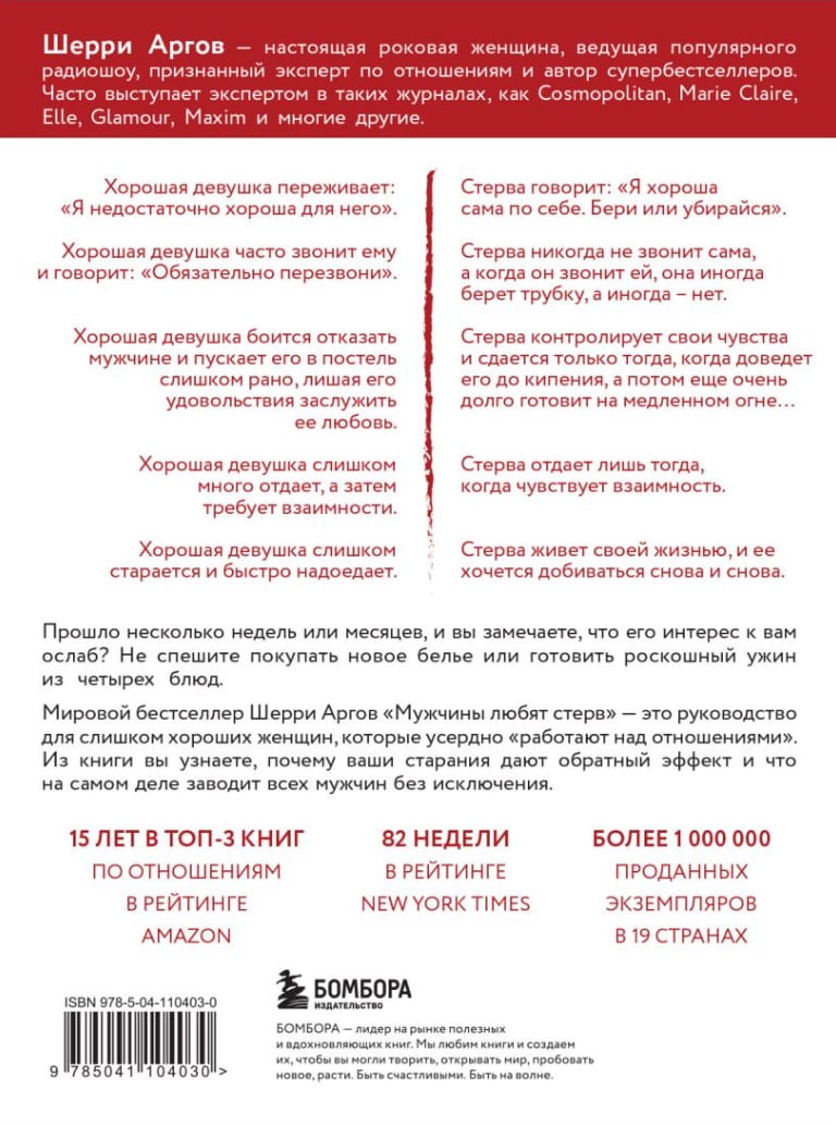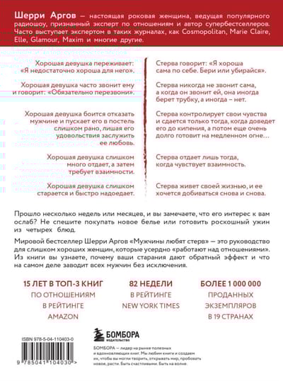 Мировой бестселлер Шерри Аргов «Мужчины любят стерв» — это руководство для слишком хороших женщин, которые усердно «работают над отношениями». Из книги вы узнаете, почему ваши старания дают обратный эффект и что на самом деле заводит всех мужчин без исключения. 100 принципов привлекательности, которые сформулировала для вас Шерри, помогут вам всегда оставаться для него женщиной мечты, которую необходимо добиваться вновь и вновь. И вы сможете развивать ваши отношения по своему собственному сценарию.