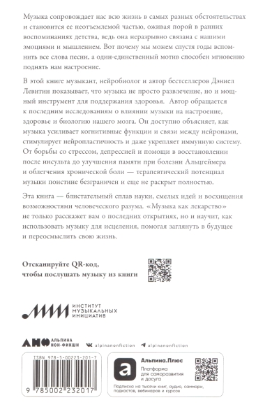 Музыка — одно из древнейших лекарств в истории человечества. От Дальнего Востока до Османской империи, от Европы до Африки и доколониальной Америки многие культуры разработали богатые традиции использования звука и ритма для облегчения страданий и помощи в исцелении. Современные исследования подтверждают, что музыка воздействует на биологию мозга, активизируя специализированные нейронные пути, синхронизируя паттерны передачи импульсов в нейронных ансамблях и модулируя ключевые нейропередатчики. Описывая результаты нейробиологических исследований и анализируя целебные свойства музыки, Левитин показывает, как и почему она может помогать и сегодня при лечении нейродегенеративных заболеваний, таких как болезнь Паркинсона и болезнь Альцгеймера, когнитивных нарушений, депрессии, болевого синдрома.