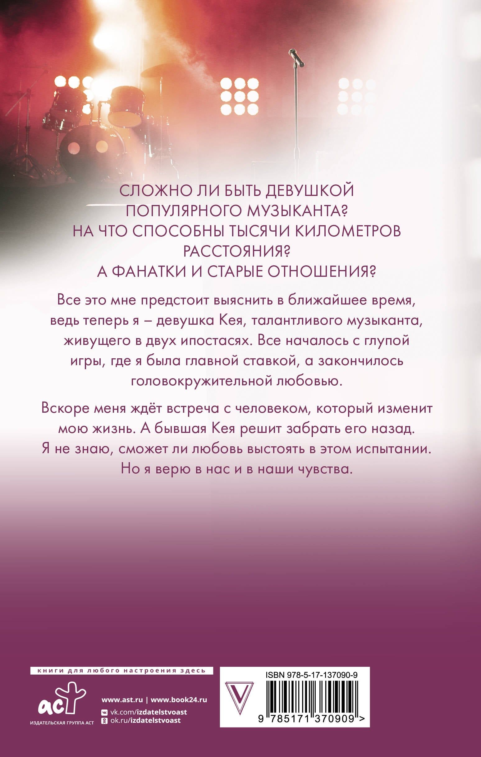 Сложно ли быть девушкой популярного музыканта? На что способны тысячи километров расстояния? А фанатки и старые отношения? Все это мне предстоит выяснить в ближайшее время, ведь теперь я – девушка Кея, талантливого музыканта, живущего в двух ипостасях. Все началось с глупой игры, где я была главной ставкой, а закончилось головокружительной любовью. Вскоре меня ждёт встреча с человеком, который изменит мою жизнь. А бывшая Кея решит забрать его назад. Я не знаю, сможет ли любовь выстоять в этом испытании. Но я верю в нас и в наши чувства.