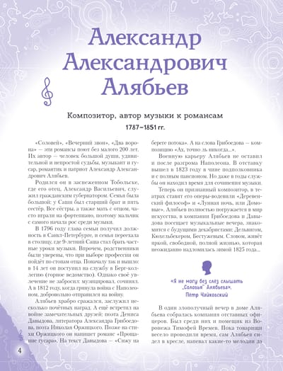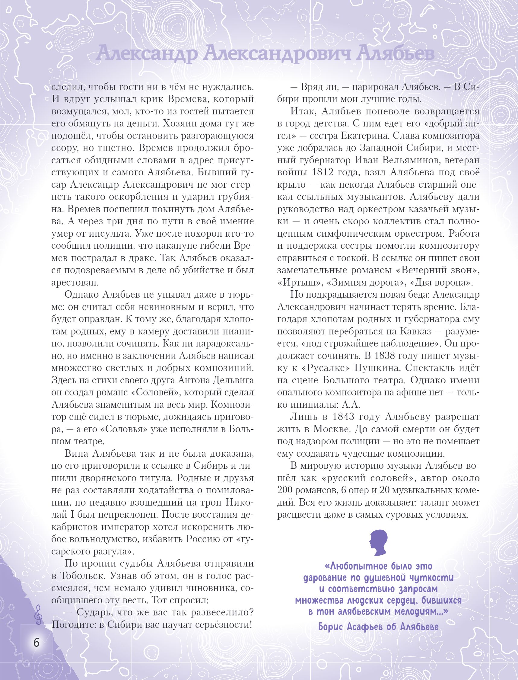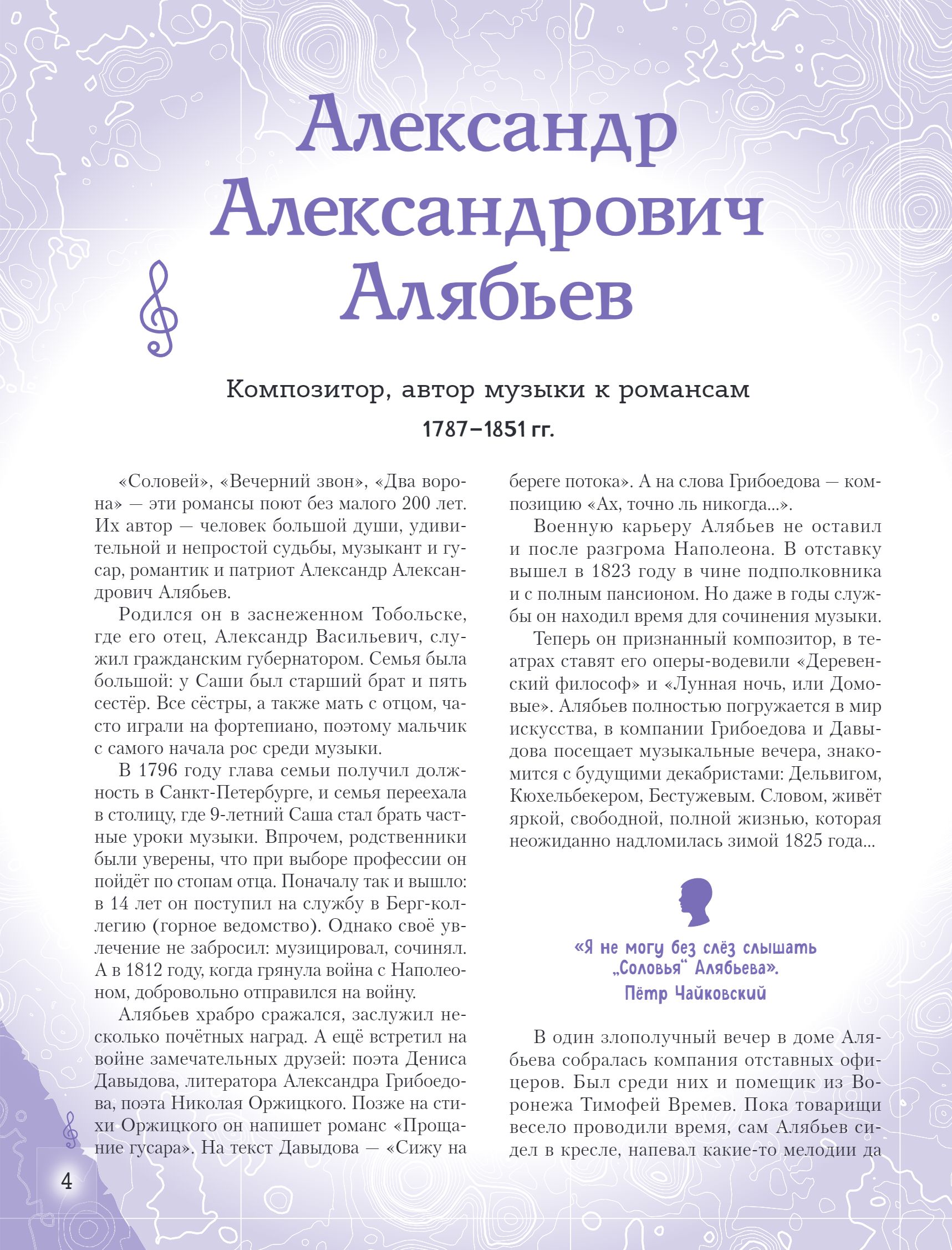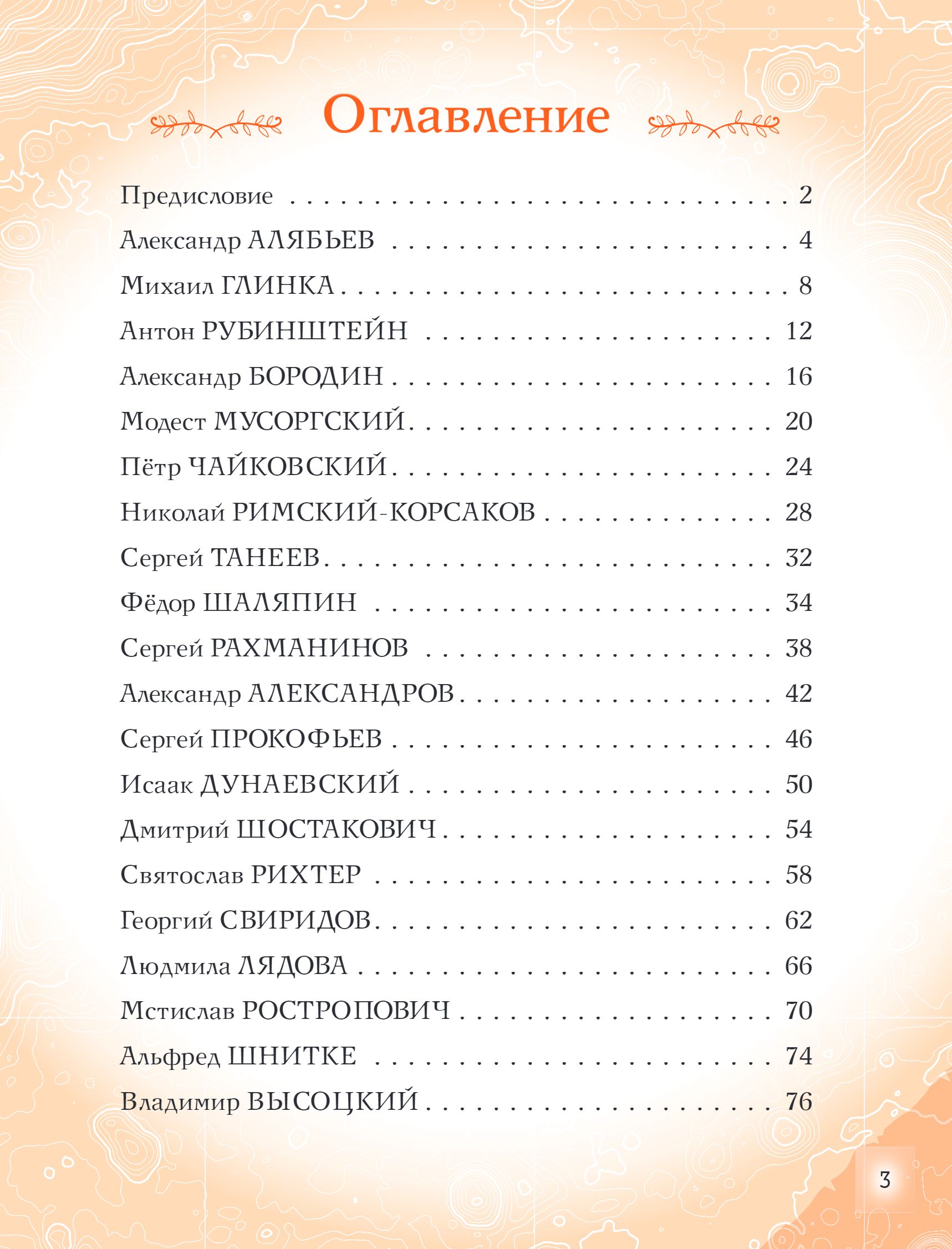 Эта книга патриотической серии «Великие люди великой страны» рассказывает о двадцати наших знаменитых соотечественниках — музыкантах, композиторах, музыковедах, певцах, чьи имена навсегда останутся в истории России. Кого называют «золотым голосом России»? При каких обстоятельствах была написана музыка к гимну нашей страны? Чьими стараниями были основаны первые русские консерватории?