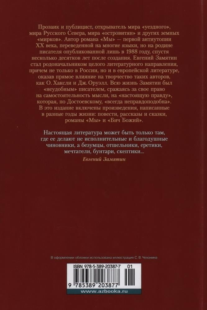 Прозаик и публицист, открыватель мира «уездного», мира Русского Севера, мира «островитян» и других земных «мирков». Автор романа «Мы» — первой антиутопии ХХ века, переведенной на многие языки, но на родине писателя опубликованной лишь в 1988 году, спустя несколько десятков лет после создания. Евгений Замятин стал родоначальником целого литературного направления, причем не только в России, но и в европейской литературе, оказав прямое влияние на творчество таких авторов, как О. Хаксли и Дж. Оруэлл. Всю жизнь Замятин был «неудобным» писателем, сражаясь за свое право на самостоятельность мысли, на «настоящую правду», которая, по Достоевскому, «всегда неправдоподобна». В это издание включены произведения, написанные в разные годы жизни: повести, рассказы и сказки, романы «Мы» и «Бич Божий».