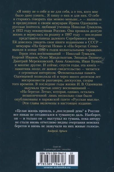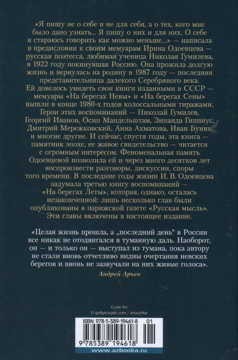 «Я пишу не о себе и не для себя, а о тех, кого мне было дано узнать… Я пишу о них и для них. О себе я стараюсь говорить как можно меньше…» — написала в предисловии к своим мемуарам Ирина Одоевцева — русская поэтесса, любимая ученица Николая Гумилева, в 1922 году покинувшая Россию. Она прожила долгую жизнь и вернулась на родину в 1987 году — последняя представительница далекого Серебряного века. Ей довелось увидеть свои книги изданными в СССР — мемуары «На берегах Невы» и «На берегах Сены» вышли в конце 1980-х годов колоссальными тиражами. Герои этих воспоминаний — Николай Гумилев, Георгий Иванов, Осип Мандельштам, Зинаида Гиппиус, Дмитрий Мережковский, Анна Ахматова, Иван Бунин и многие другие. И сейчас, спустя годы, эта книга — памятник эпохе, ее живое свидетельство — читается с огромным интересом. Феноменальная память Одоевцевой позволила ей и через много десятков лет воспроизвести разговоры, дискуссии, споры того времени. В последние годы жизни И. В. Одоевцева задумала третью книгу воспоминаний — «На берегах Леты», которая, однако, осталась незаконченной: лишь несколько глав были опубликованы в парижской газете «Русская мысль». Эти главы включены в настоящее издание.