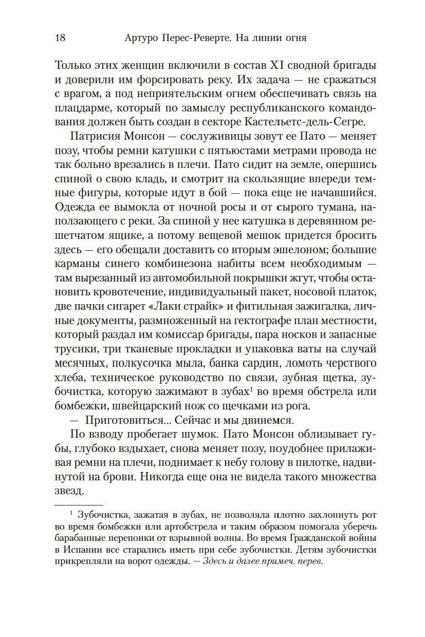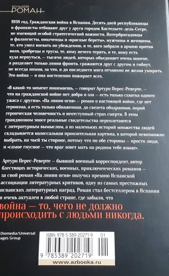 «В какой-то момент понимаешь, — говорит Артуро Перес-Реверте, — что на гражданской войне нет добра и зла — есть только схватка одного ужаса с другим». «На линии огня» — роман о настоящей войне, где нет героизма, а есть только обнаженная, до скелета ободранная и порой героическая человечность и неотступный страх смерти. В этом грандиозном эпосе реальные свидетельства переплетаются с литературным вымыслом, а из маленьких историй множества людей складывается колоссальная пронзительная картина, в которой невозможно выбрать, на чьей ты стороне, потому что по обе стороны — просто люди, и «самое гнусное — что враг зовет мать на родном тебе языке».